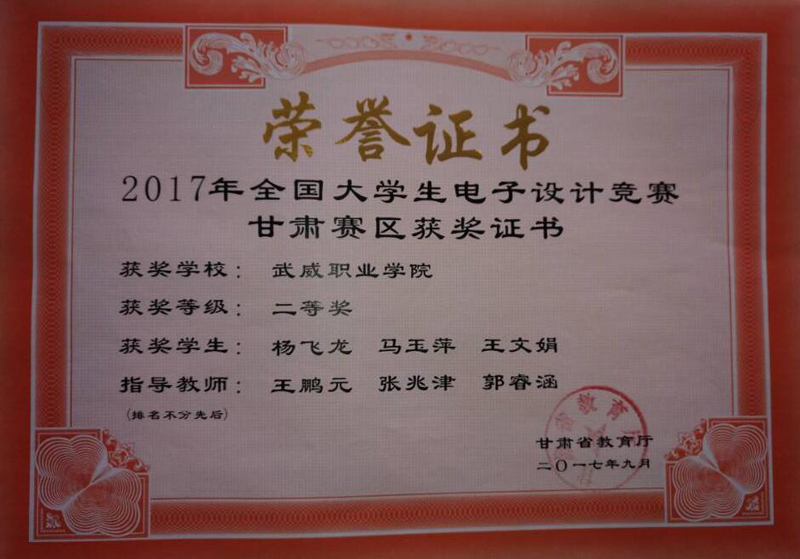 近日,2017年全國大學(xué)生電子設(shè)計競賽甘肅賽區(qū)成績揭曉。由電子信息工程系2016級應(yīng)用電子技術(shù)專業(yè)楊飛龍、馬玉萍、王文娟3名同學(xué)組成的團(tuán)隊在我系王鵬元、張兆津、郭睿涵3名教師指導(dǎo)下榮獲甘肅賽區(qū)二等獎。此次獲獎也是我系在優(yōu)質(zhì)校建設(shè)中狠抓教學(xué)科研和學(xué)生技能培養(yǎng)方面取得的豐碩成果。