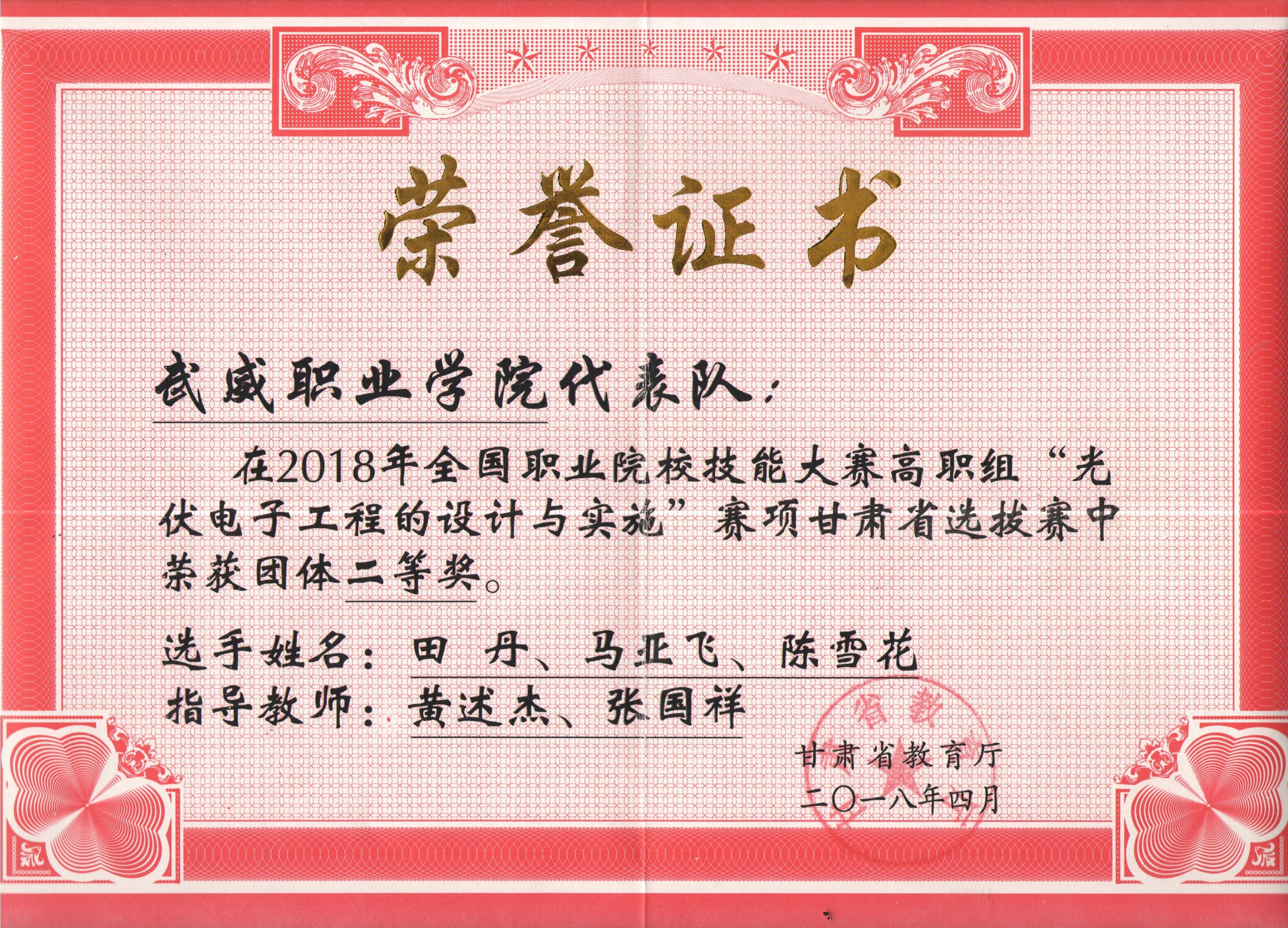 4月14日,2018年全國職業(yè)院校技能大賽“光伏電子工程的設(shè)計(jì)與實(shí)施”賽項(xiàng)甘肅省選拔賽在甘肅林業(yè)職業(yè)技術(shù)學(xué)院舉行。此次大賽有蘭州石化職業(yè)技術(shù)學(xué)院、甘肅林業(yè)職業(yè)技術(shù)學(xué)院、武威職業(yè)學(xué)院等6所院校的11支代表隊(duì)33名選手參加。由我院能源工程系黃述杰、張國祥老師指導(dǎo),田丹、馬亞飛、陳雪花三名學(xué)生組成的武威職業(yè)學(xué)院一隊(duì)榮獲二等獎(jiǎng)。