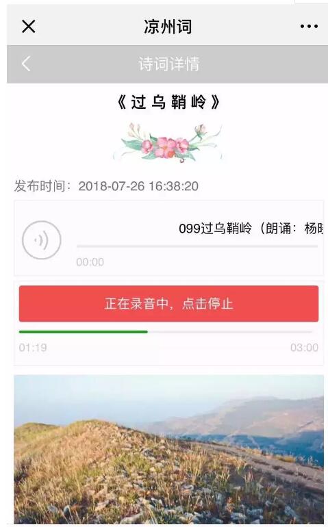 2.單擊自己選定的條目或詩詞名即可進入吟誦頁面,點擊”我要吟誦”開始錄入音頻,?吟誦結(jié)束后點擊提交,保存音頻資料即可完成吟誦,已保存的詩詞音頻可在“我的吟誦”列表查看。