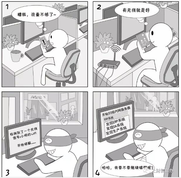 無線路由器有較多的安全隱患,比如之前的wep認(rèn)證能很輕易破解。個人架設(shè)無線路由器,如果配置不當(dāng),家用最多導(dǎo)致蹭網(wǎng)或個人資料泄露,但在單位使用可能會導(dǎo)致內(nèi)網(wǎng)被入侵,單位機(jī)密、客戶資料泄密,后果不堪設(shè)想。
