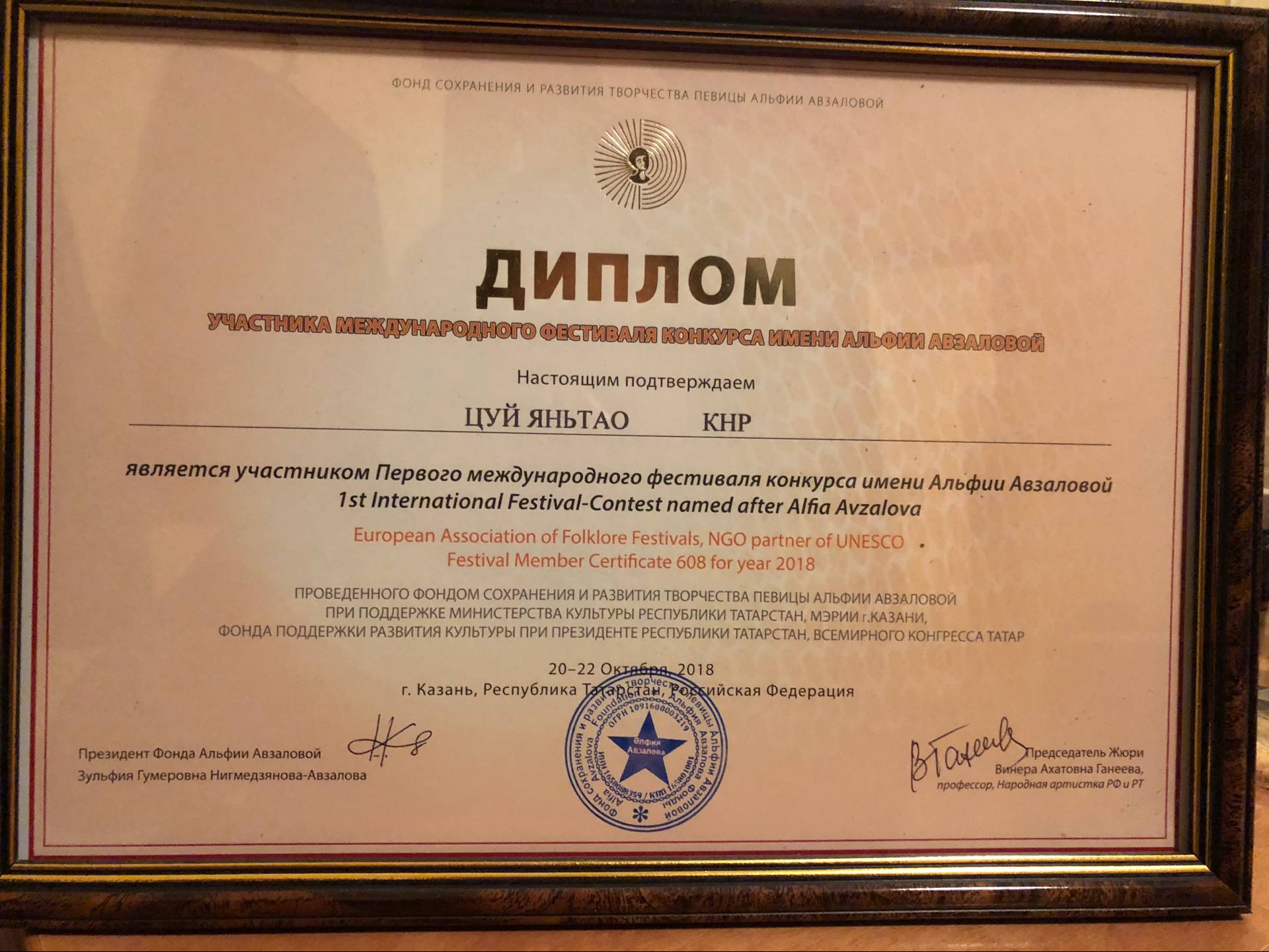 ? ? 1.在以阿菲亞·阿夫扎洛娃命名的第一屆國際比賽節(jié)(First international contest festiva Named After Alfia avzalova)獲得二等獎,一等獎空缺。