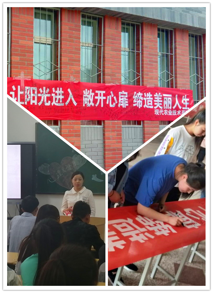 邀請現(xiàn)代農(nóng)業(yè)技術(shù)系張曉燕老師做了題為《預(yù)見未知的自己》的講座;系團(tuán)學(xué)會(huì)組織學(xué)生參加“打開心靈的窗戶,讓陽光進(jìn)入;敞開心扉,締造美麗人生。”主題簽名活動(dòng)。各班召開心理健康主題班會(huì)、開展心理游戲和手抄報(bào)活動(dòng)。
