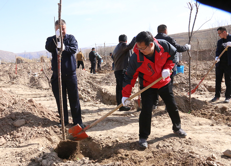 春風(fēng)吹拂處,新綠綻枝頭。為深入學(xué)習(xí)貫徹習(xí)近平總書記視察甘肅的重要講話和批示精神,認(rèn)真踐行綠水青山就是金山銀山的發(fā)展理念,實(shí)施綠色發(fā)展戰(zhàn)略,進(jìn)一步加強(qiáng)祁連山生態(tài)環(huán)境保護(hù)與治理,幫助幫扶鎮(zhèn)打贏脫貧攻堅(jiān)戰(zhàn),實(shí)施鄉(xiāng)村振興戰(zhàn)略,4月9日,學(xué)院領(lǐng)導(dǎo)班子成員、幫扶干部、駐村干部及部分教職工70多人深入結(jié)對(duì)幫扶鎮(zhèn)——黑松驛鎮(zhèn)開展義務(wù)植樹活動(dòng),建設(shè)“生態(tài)示范林”。春光沐浴的祁連山腳下黑松驛鎮(zhèn),春意盎然,生機(jī)勃勃,正是植樹好時(shí)節(jié)。廣大教職工一下車就拿起鐵鍬到植樹現(xiàn)場(chǎng),與黑松驛鎮(zhèn)政府部分干部一起投入植樹活動(dòng),按照“橫看直線側(cè)一線、三埋兩踩一提苗”的技術(shù)要求,三人一組,分工協(xié)作,有序配合,揮鍬培土、扶苖踩土、圍堰澆水,現(xiàn)場(chǎng)一派熱火朝天的勞動(dòng)景象。當(dāng)天植樹育林約20余畝,一棵棵新栽的樹苗整齊排列,迎風(fēng)挺立。通過義務(wù)植樹,廣大教職工用實(shí)際行動(dòng)傳播著生態(tài)文明、綠色發(fā)展理念,切實(shí)幫助幫扶鎮(zhèn)綠起來,美起來,富起來。