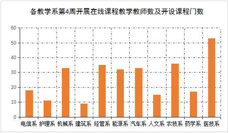 第4周,各教學(xué)系在線課程按照教學(xué)安排全部上線運(yùn)行,實(shí)際開(kāi)課315門,較第1-2周(284門次)有所增加。在線課程達(dá)到“應(yīng)開(kāi)盡開(kāi)”的目標(biāo),全部在線課程整體運(yùn)行平穩(wěn)有序。本周授課總學(xué)時(shí)達(dá)到1681學(xué)時(shí),教師參加在線授課共計(jì)1631人次。