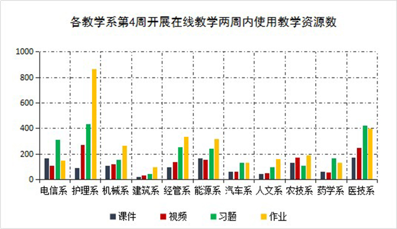 開(kāi)課四周,教師積極補(bǔ)充完善教學(xué)資源,優(yōu)化學(xué)生在線學(xué)習(xí)體驗(yàn)。通過(guò)數(shù)據(jù)統(tǒng)計(jì),本周內(nèi)已開(kāi)課程新增教學(xué)課件1141個(gè),發(fā)布教學(xué)視頻1412個(gè),教師上傳課堂練習(xí)題2367道,布置課后作業(yè)3049道,極大的補(bǔ)充和豐富了學(xué)院在線課程資源。