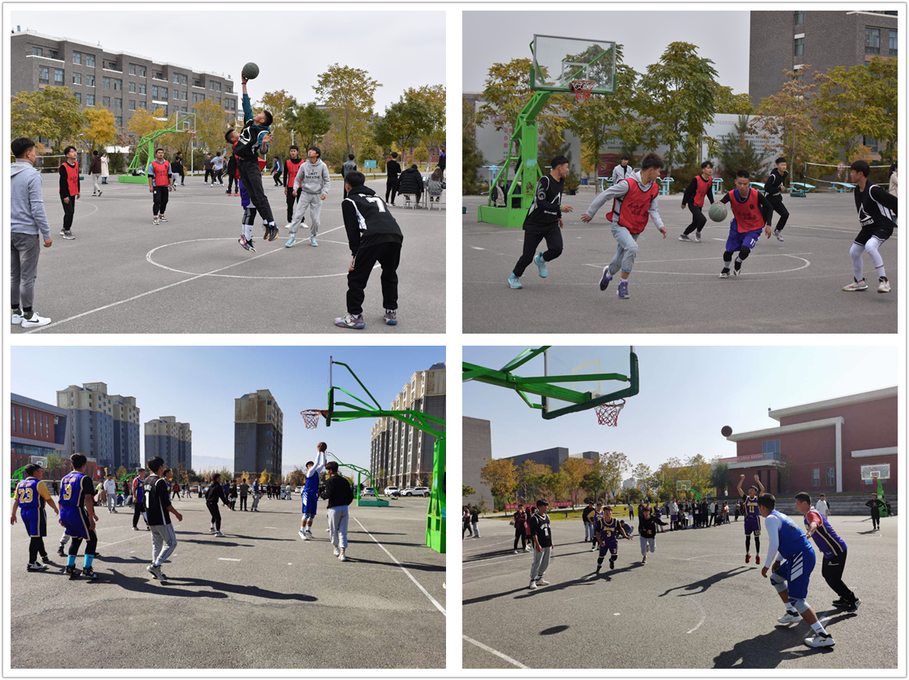 籃球比賽共有12支隊(duì)伍參加比賽,在賽場上運(yùn)動員積極拼搏、全力以赴。場下的同學(xué)們努力為運(yùn)動員吶喊助威,為運(yùn)動員們注入了強(qiáng)大的精神動力。