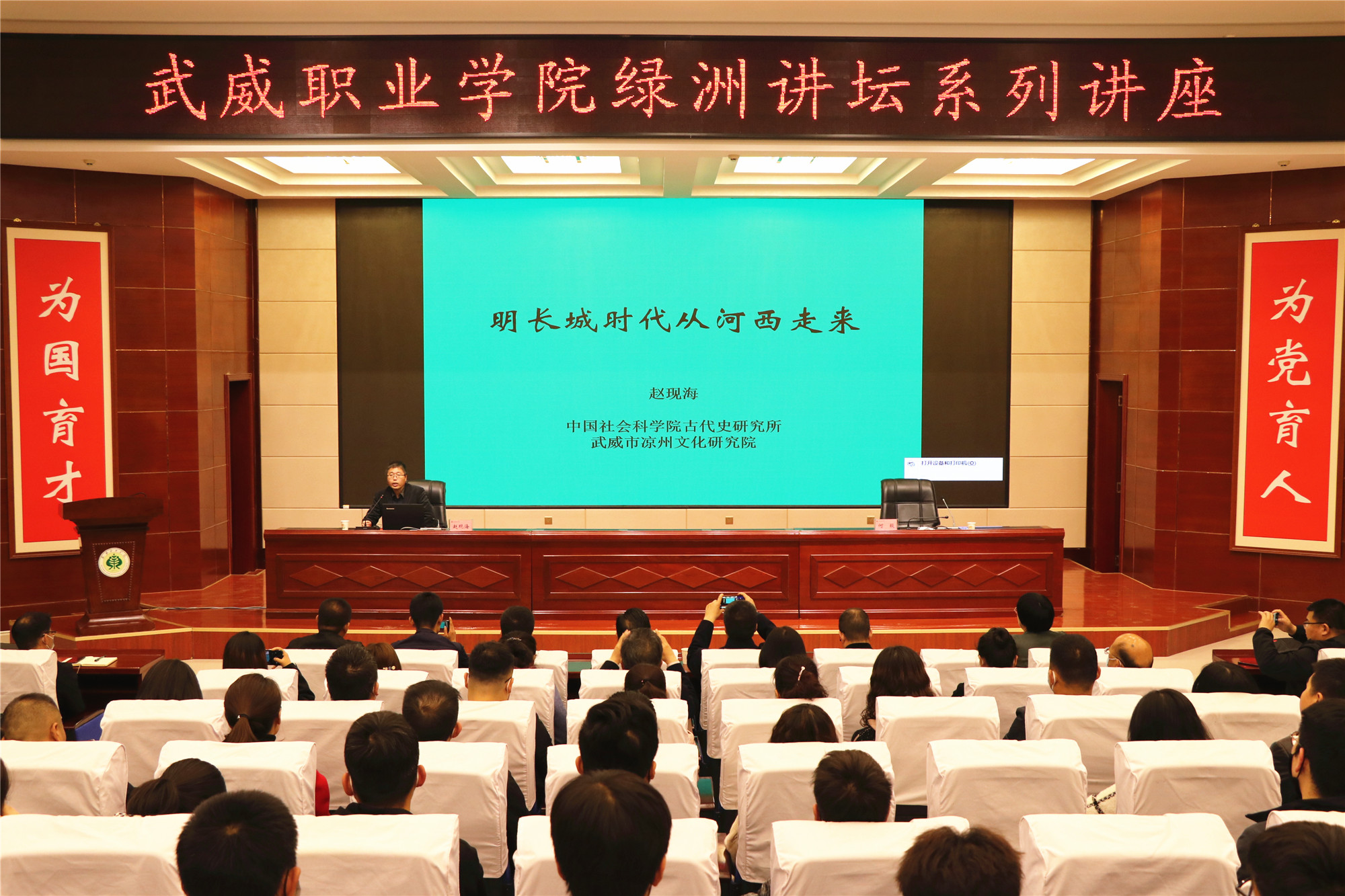 4月2日,學(xué)院綠洲講壇第40期開講,由中國(guó)社會(huì)科學(xué)院古代史研究所研究員,明史研究室主任,市涼州文化研究院副院長(zhǎng)趙現(xiàn)海同志為師生進(jìn)行《明長(zhǎng)城時(shí)代從河西走來》的專題報(bào)告。學(xué)院領(lǐng)導(dǎo)、涼州文化研究院相關(guān)領(lǐng)導(dǎo)和工作人員,西關(guān)科技巷社區(qū)領(lǐng)導(dǎo)和學(xué)院師生代表220人參加了報(bào)告會(huì)。黨委委員、副院長(zhǎng)何毅主持報(bào)告會(huì)。