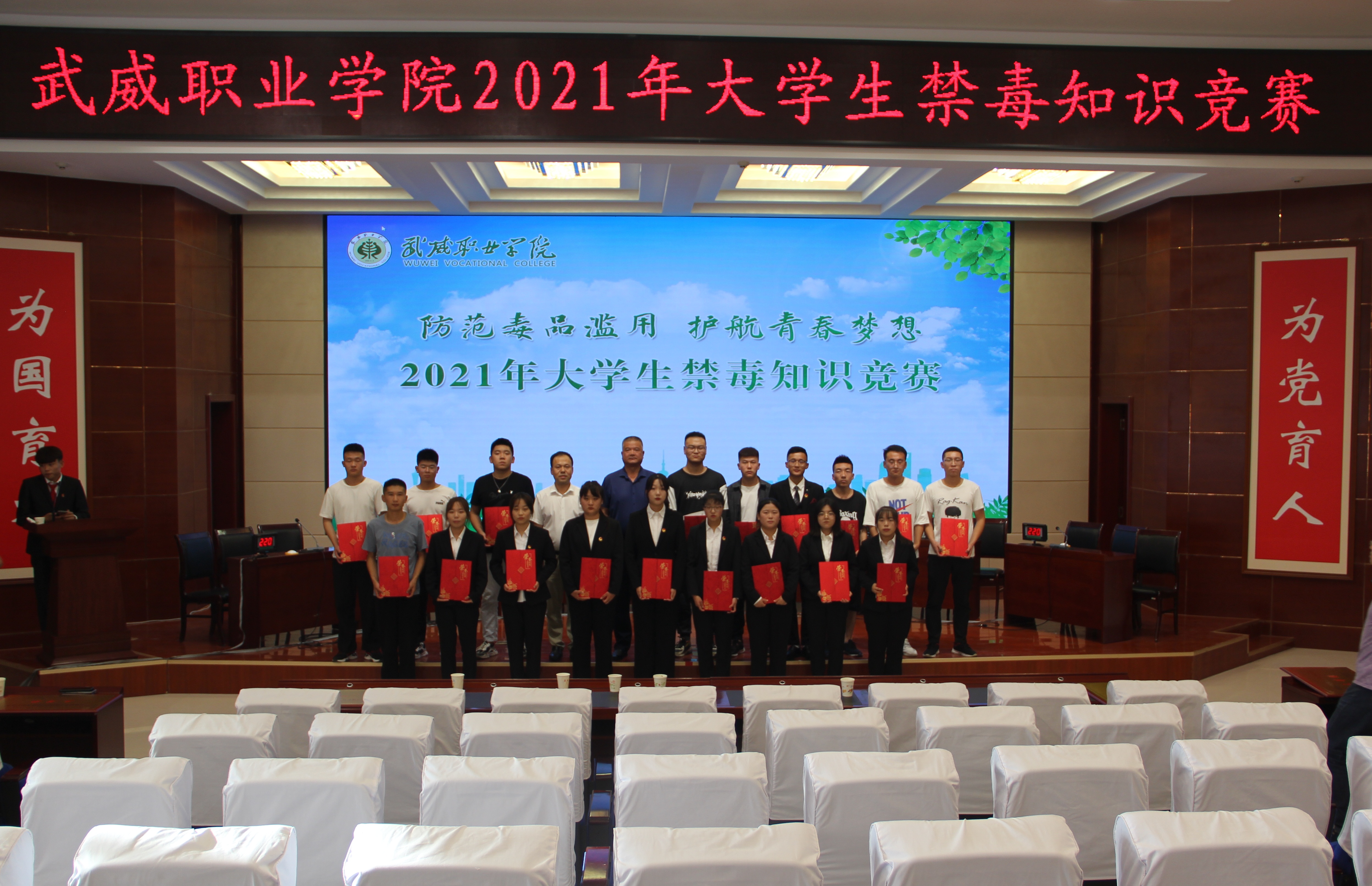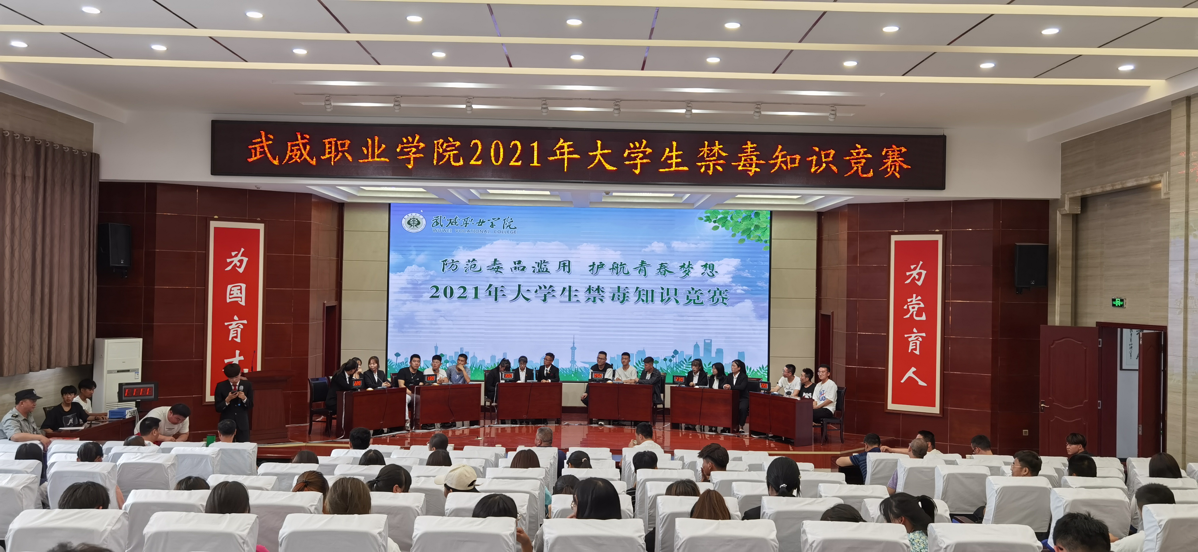 為加強在校大學生禁毒知識普及教育,深入推進青少年毒品預(yù)防教育“6.27”工程,7月5日下午,學院在菁英廳舉辦以“防范毒品濫用,護航青春夢想”為主題的2021年大學生禁毒知識競賽決賽。學院黨委委員、副院長王守云出席活動。各教學院系200多名師生觀看了比賽。