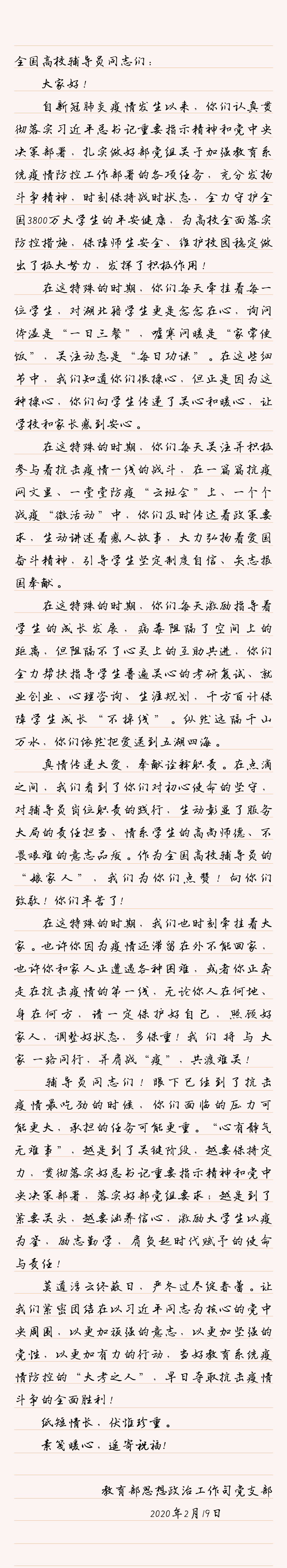 共克時艱 勠力同行 | 教育部思政司黨支部致全國高校輔導(dǎo)員的一封信