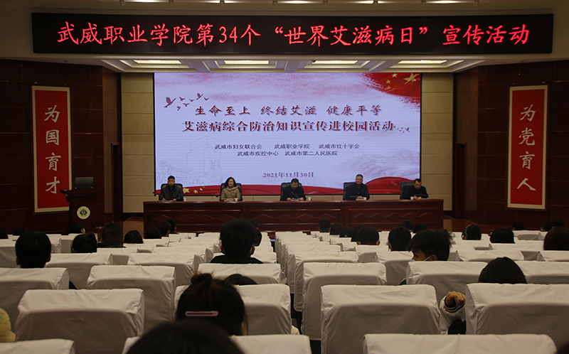 11月30日,學(xué)院在菁英廳開展了“生命至上 終結(jié)艾滋 健康平等”艾滋病綜合防治知識宣傳進(jìn)校園活動(dòng)。市疾控中心工會主席張富國、市婦聯(lián)副主席張惠華、學(xué)院黨委委員、副院長王守云,市第二人民醫(yī)院院長滕亮出席活動(dòng),活動(dòng)由學(xué)院護(hù)理系黨總支書記張建輝主持,市紅十字會、市疾控中心、天馬行市民云數(shù)據(jù)有限公司工作人員及武威職業(yè)學(xué)院師生代表參加活動(dòng)。
