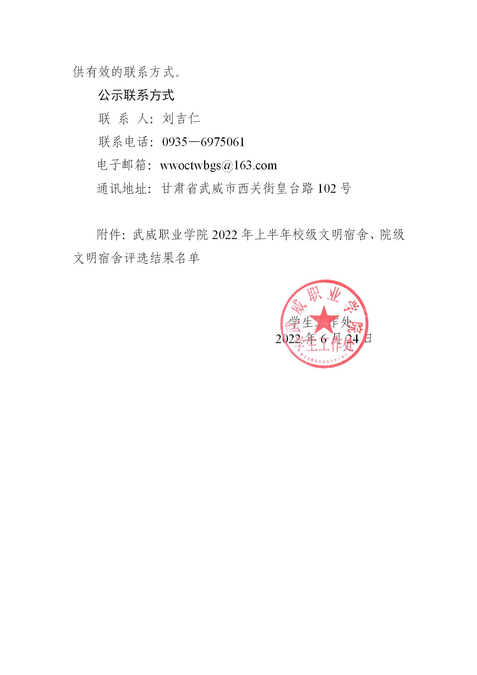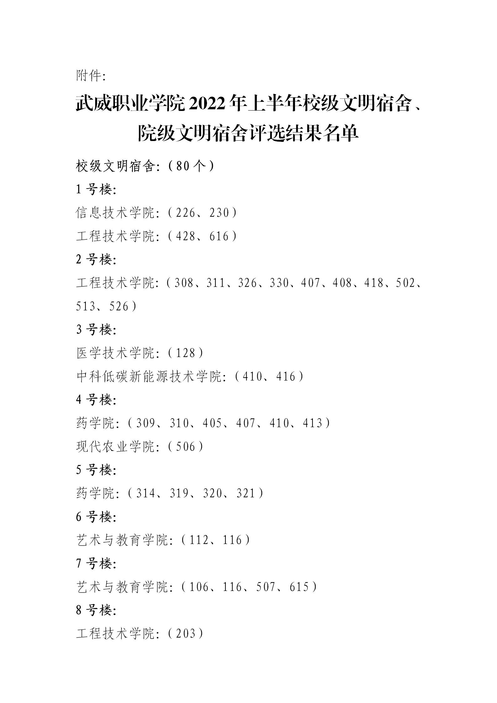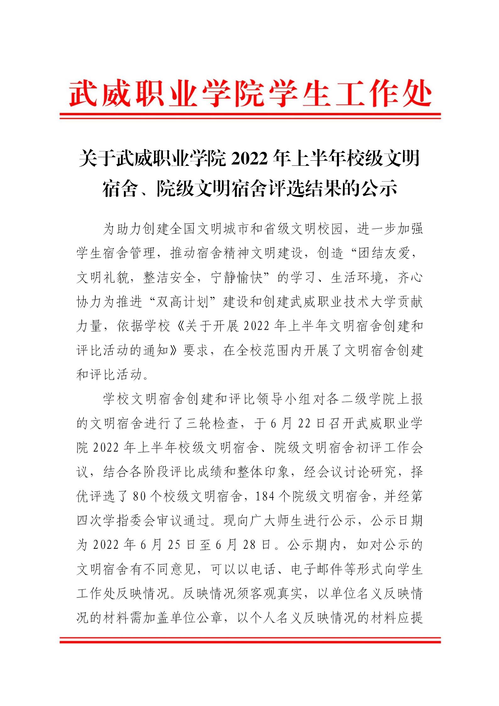 關于武威職業(yè)學院2022年上半年校級文明宿舍、院級文明宿舍評選結果的公示