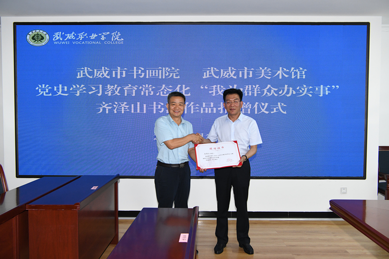 此次捐贈(zèng)儀式既是學(xué)校加強(qiáng)校園文化建設(shè)的重要舉措,也是黨史學(xué)習(xí)教育常態(tài)化“我為群眾辦實(shí)事”的具體體現(xiàn),學(xué)校將進(jìn)一步加強(qiáng)與市書畫院、美術(shù)館的文化藝術(shù)交流,傳承和弘揚(yáng)中華優(yōu)秀傳統(tǒng)文化,提升校園文化軟實(shí)力,加強(qiáng)師生美育教育,以德潤(rùn)心,以文化人,推動(dòng)學(xué)校“雙高計(jì)劃”建設(shè),全力以赴申辦武威職業(yè)技術(shù)大學(xué)。