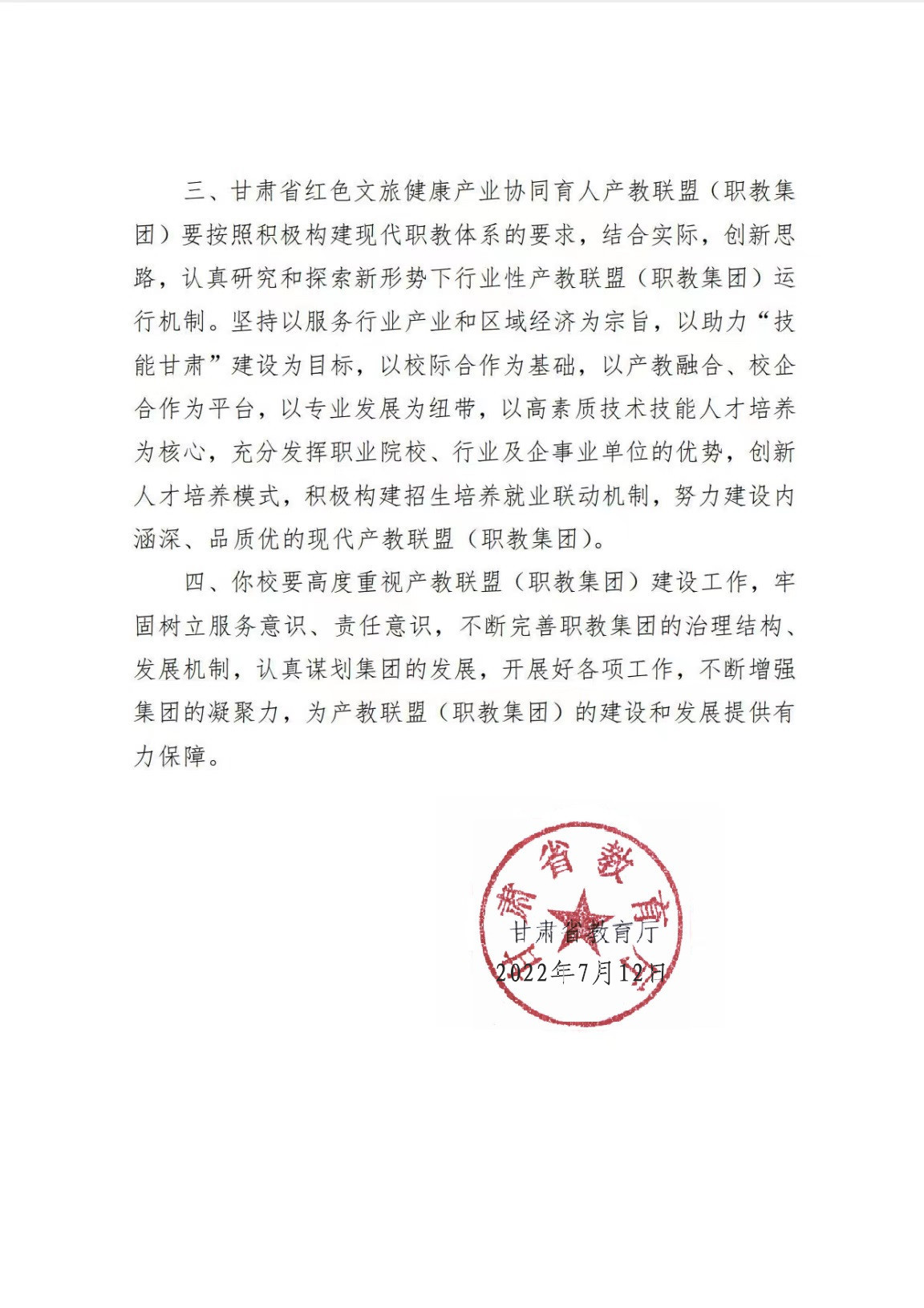 日前,甘肅省教育廳批復(fù)我校成立“甘肅省紅色文旅健康產(chǎn)業(yè)協(xié)同育人產(chǎn)教聯(lián)盟(職教集團(tuán))”。