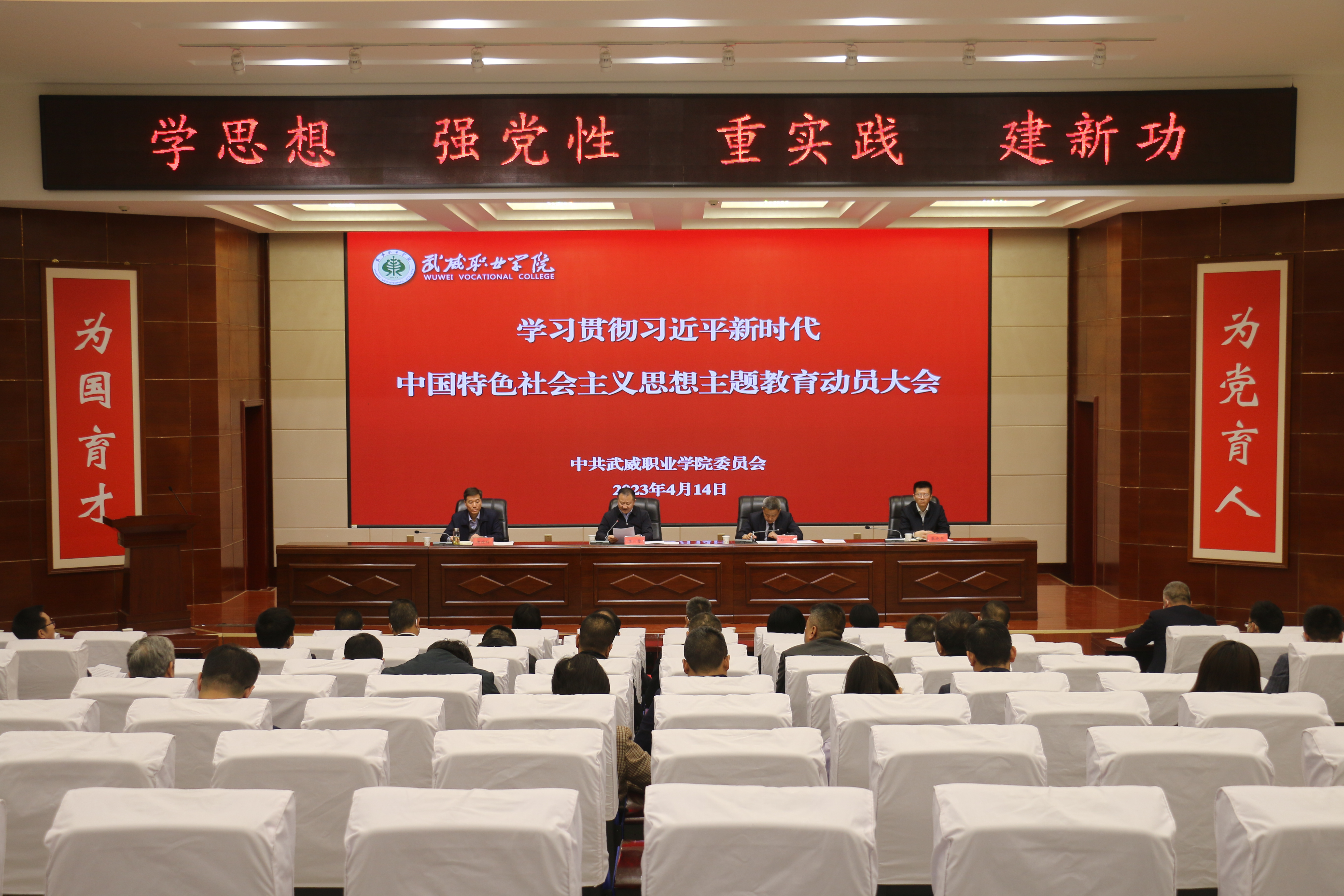 4月14日下午,學(xué)校召開學(xué)習(xí)貫徹習(xí)近平新時代中國特色社會主義思想主題教育動員部署會議。省委第十巡回指導(dǎo)組副組長、省景泰川電力提灌水資源利用中心黨委委員、副主任廖贊到會指導(dǎo)并講話。學(xué)校黨委書記、校長、主題教育領(lǐng)導(dǎo)小組組長趙明主持會議,傳達(dá)中央主題教育工作會議精神和省委主題教育動員部署會議精神并作動員講話。