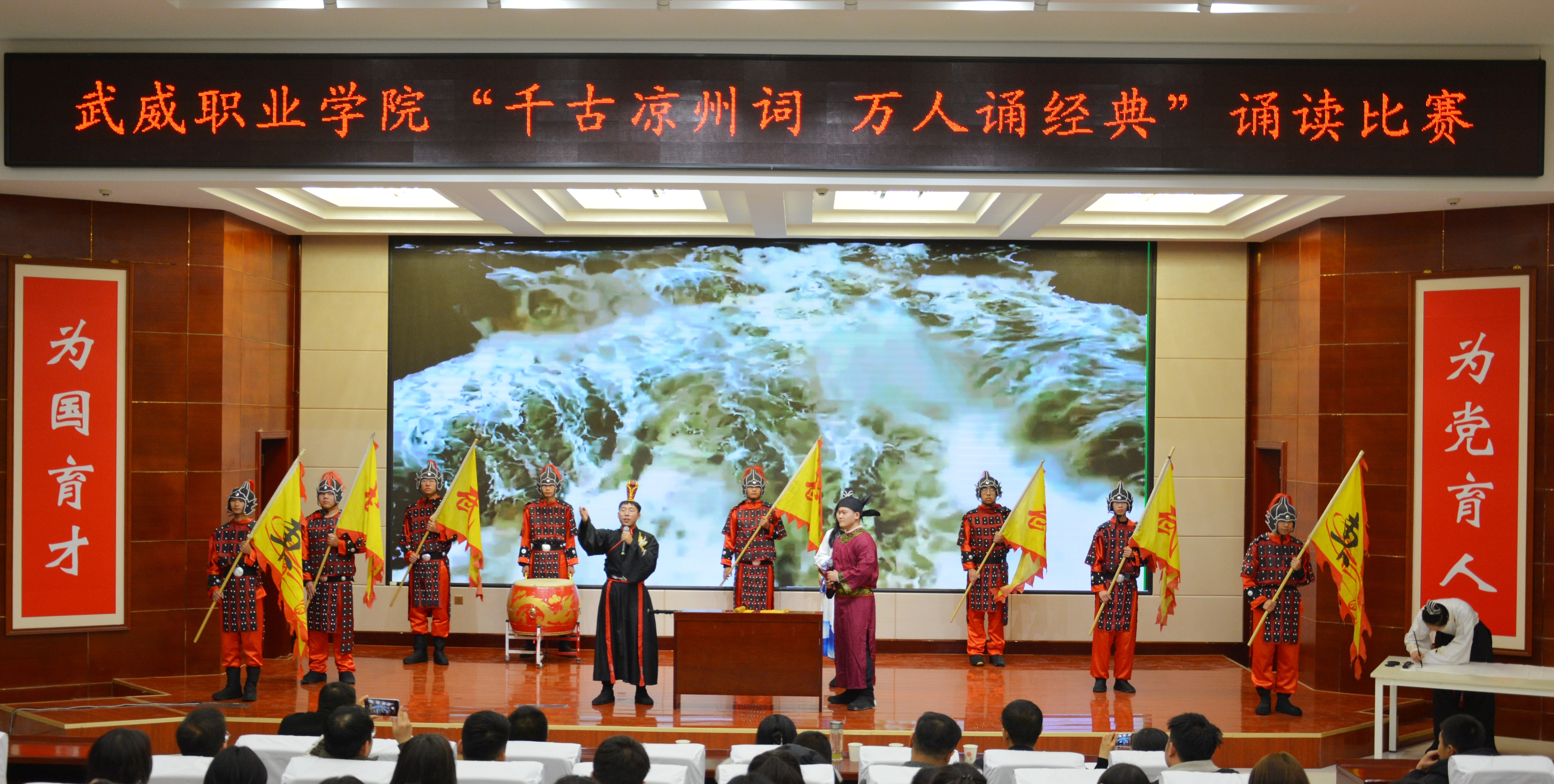 比賽現(xiàn)場精彩紛呈,現(xiàn)場氣氛異常熱烈,掌聲此起彼伏。節(jié)目以詩歌吟誦、伴舞、書法、國畫、武術(shù)、情景表演等豐富多彩的藝術(shù)形式,為現(xiàn)場觀眾打造出一場別開生面的涼州文化視聽盛宴。同學(xué)們激情洋溢,用澎湃真摯的情感演繹著經(jīng)典燦爛的磅礴詩篇,用跨越千年的對話勾勒出雄渾壯烈的漢武雄風(fēng),用鏗鏘有力的旋律編織出蕩氣回腸的時(shí)代頌歌,以青春奮斗的初心賡續(xù)著生生不息的五涼文化。