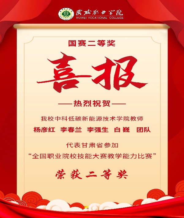 近日,2023年全國(guó)職業(yè)院校技能大賽教學(xué)能力比賽決賽在江西現(xiàn)代職業(yè)技術(shù)學(xué)院落下帷幕,由中科低碳新能源學(xué)院教師楊彥紅、李春蘭、李強(qiáng)生、白巍組成的參賽團(tuán)隊(duì)作為甘肅省唯一一支打入國(guó)賽決賽的團(tuán)隊(duì),代表甘肅省參加比賽,喜獲專(zhuān)業(yè)課程高職一組二等獎(jiǎng)。