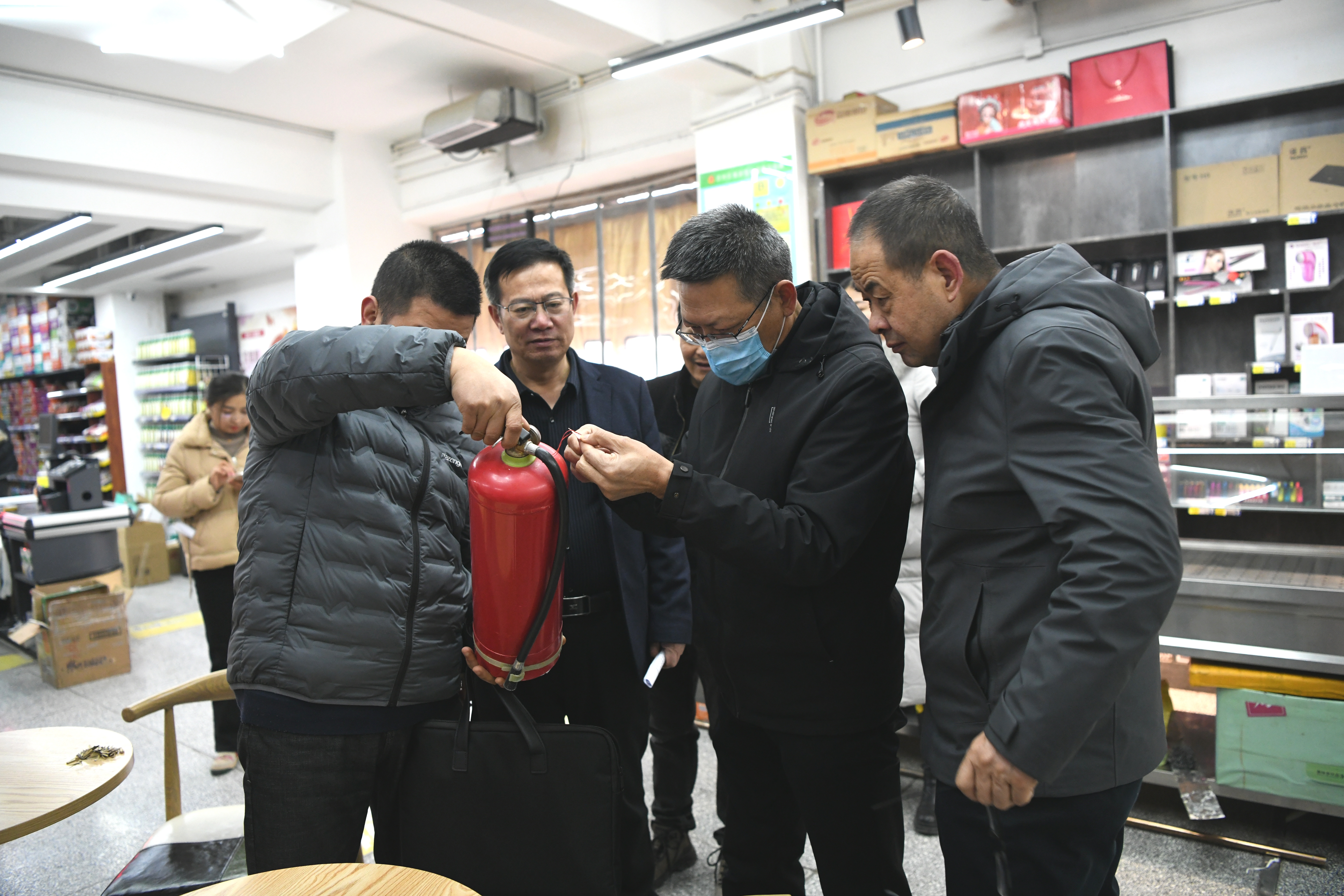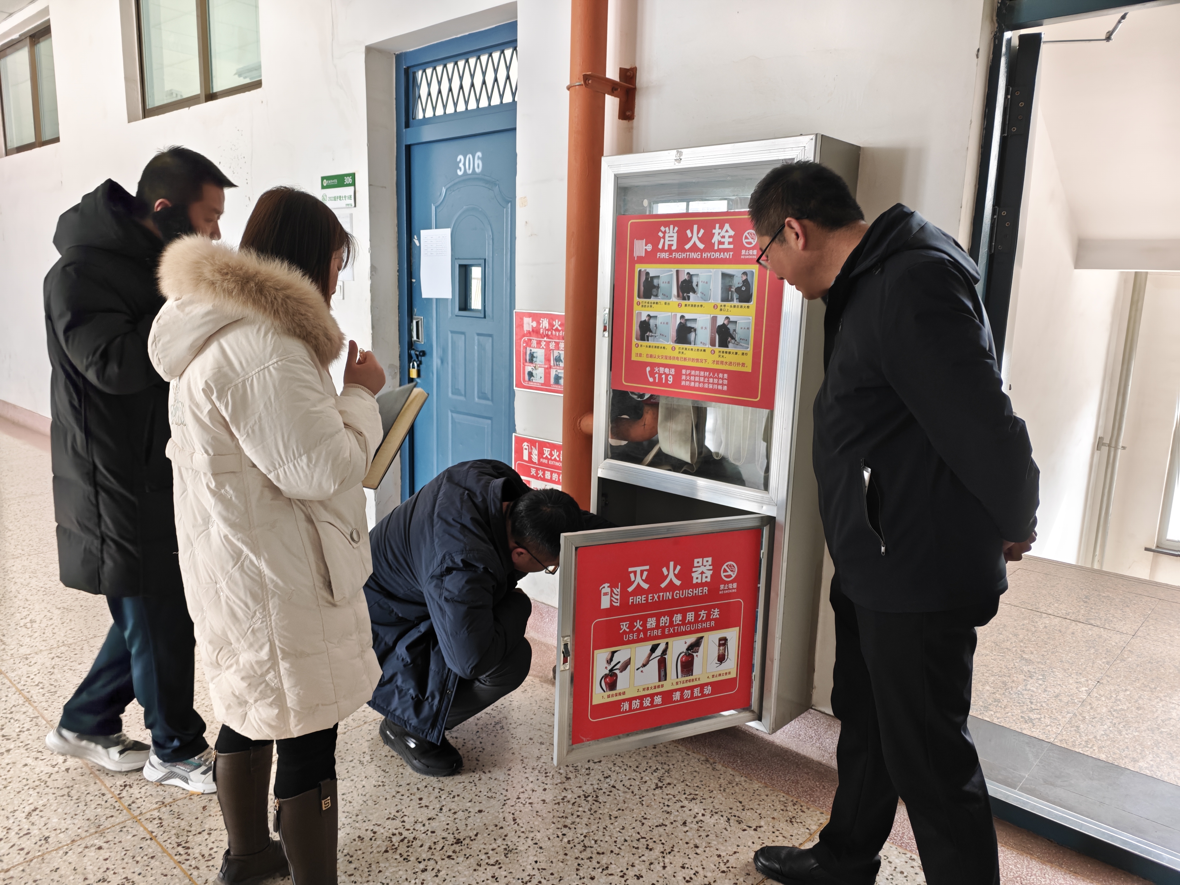 在實(shí)驗(yàn)實(shí)訓(xùn)室內(nèi),督察組詢問設(shè)施設(shè)備準(zhǔn)備情況,逐一檢查實(shí)訓(xùn)場(chǎng)地內(nèi)消防安全設(shè)施配備情況。