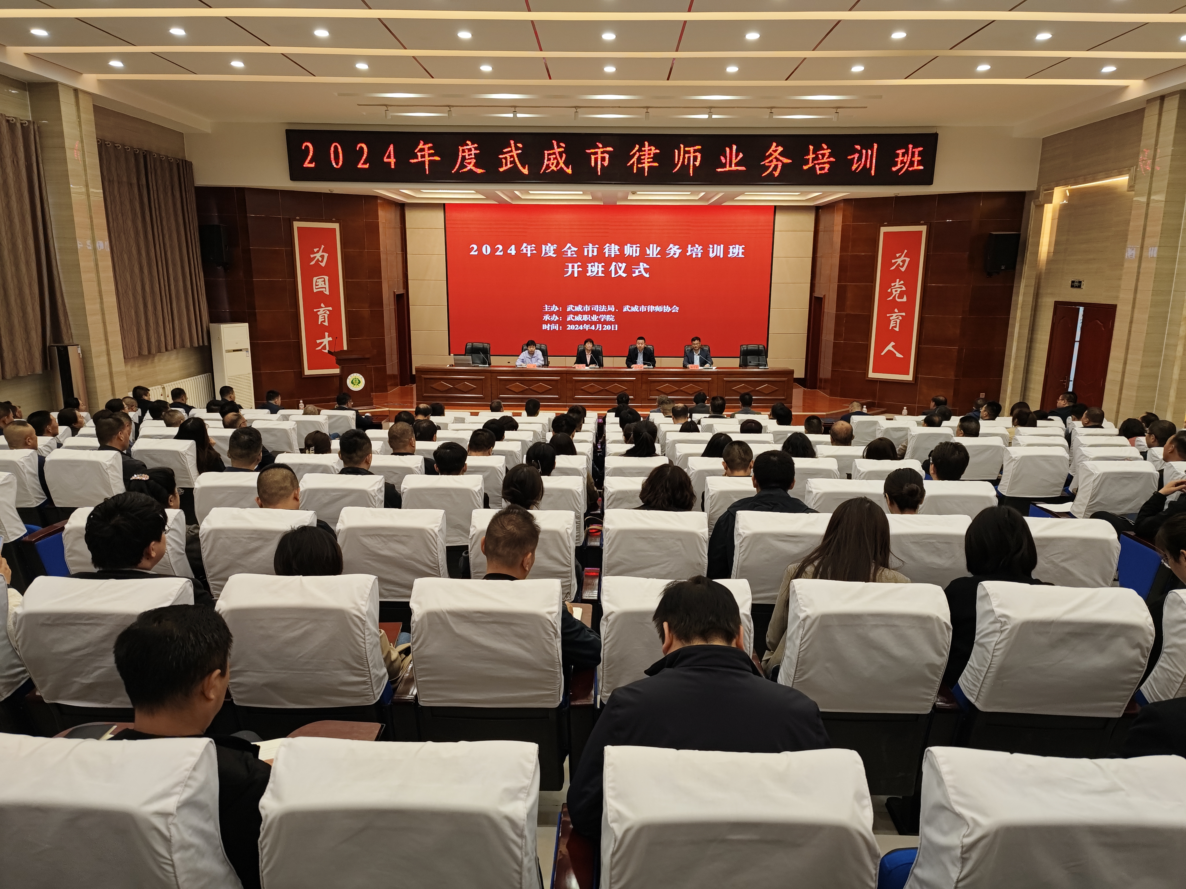 4月20日上午,由武威市司法局、武威市律師協(xié)會主辦,武威職業(yè)學院承辦的2024年度武威市律師業(yè)務培訓班在學生發(fā)展中心箐英廳舉行開班儀式。武威職業(yè)學院黨委委員、副校長何毅,武威市司法局黨組成員、副局長,市律師行業(yè)黨委書記何虎基,武威市司法局律師和法律職業(yè)資格管理科長閆芳出席開班儀式。武威市律師協(xié)會會長、市律師行業(yè)黨委副書記陳守安主持開班儀式。全市注冊的專(兼)職律師、法援律師、公職律師、公司律師及實習律師共計220人參加開班儀式。