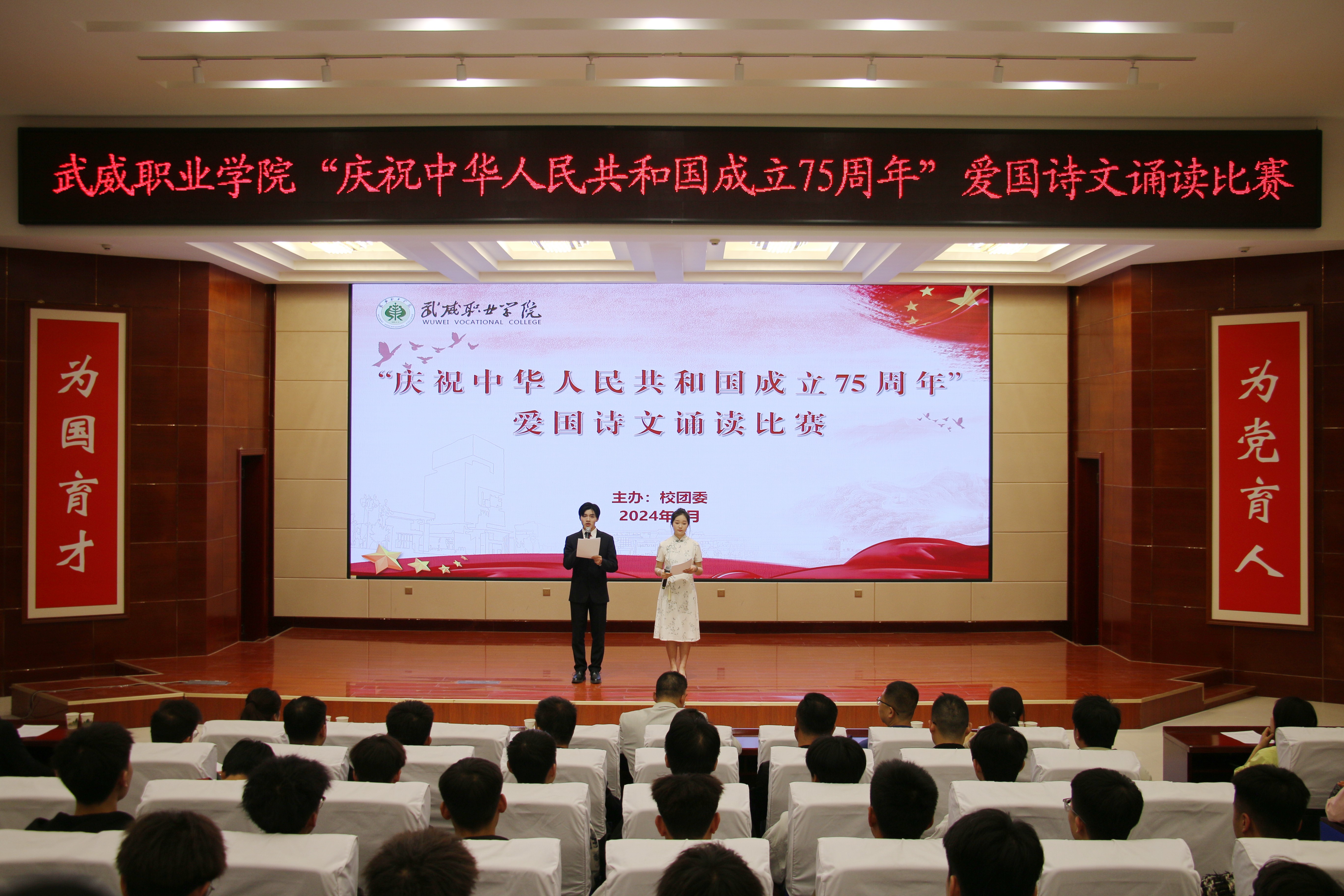 4月25日晚,學(xué)校“紀(jì)念‘五四’運(yùn)動(dòng)105周年暨慶祝新中國(guó)成立75周年”愛(ài)國(guó)詩(shī)文誦讀比賽在菁英廳舉辦。黨委委員、副校長(zhǎng)王守云出席活動(dòng),各二級(jí)學(xué)院團(tuán)委書(shū)記及學(xué)生代表220余人觀看比賽。
