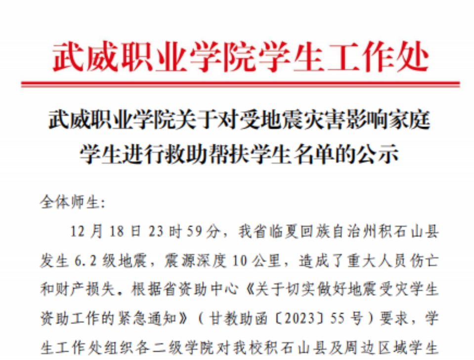 12月18日23時(shí)59分,我省臨夏回族自治州積石山縣發(fā)生6.2級(jí)地震。地震發(fā)生后,學(xué)校高度重視災(zāi)區(qū)學(xué)生家庭受災(zāi)情況,密切關(guān)注各項(xiàng)災(zāi)情的發(fā)展變化,第一時(shí)間對(duì)積石山縣及周邊區(qū)域地震受災(zāi)家庭學(xué)生情況進(jìn)行摸排,迅速啟動(dòng)救助幫扶關(guān)愛工作。