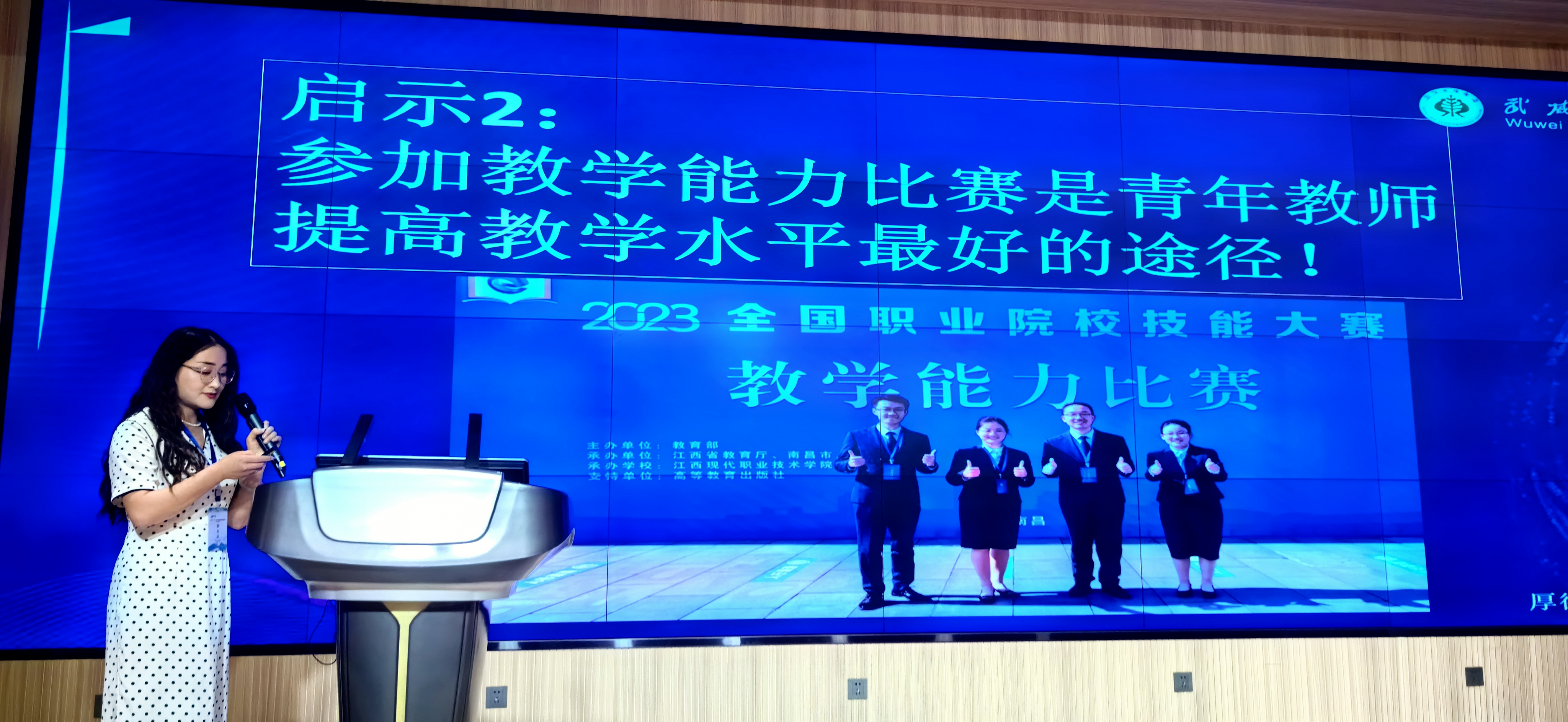 在年會上,集群內(nèi)職業(yè)院校代表簽署中高職貫通培養(yǎng)合作協(xié)議,武威職業(yè)學(xué)院與武威市涼州區(qū)職業(yè)中等專業(yè)學(xué)校進行了簽約。根據(jù)省教育廳安排,我校中科低碳新能源技術(shù)學(xué)院教師楊彥紅在分會上分享了全國職業(yè)院校技能大賽教學(xué)能力比賽的經(jīng)驗,楊彥紅老師分三個方面向大家分享了參賽經(jīng)驗及參賽作品的特色創(chuàng)新亮點,也向參會的各行各業(yè)人士分享了武威職業(yè)學(xué)院近四年以來在教學(xué)能力比賽方面取得的好成績。