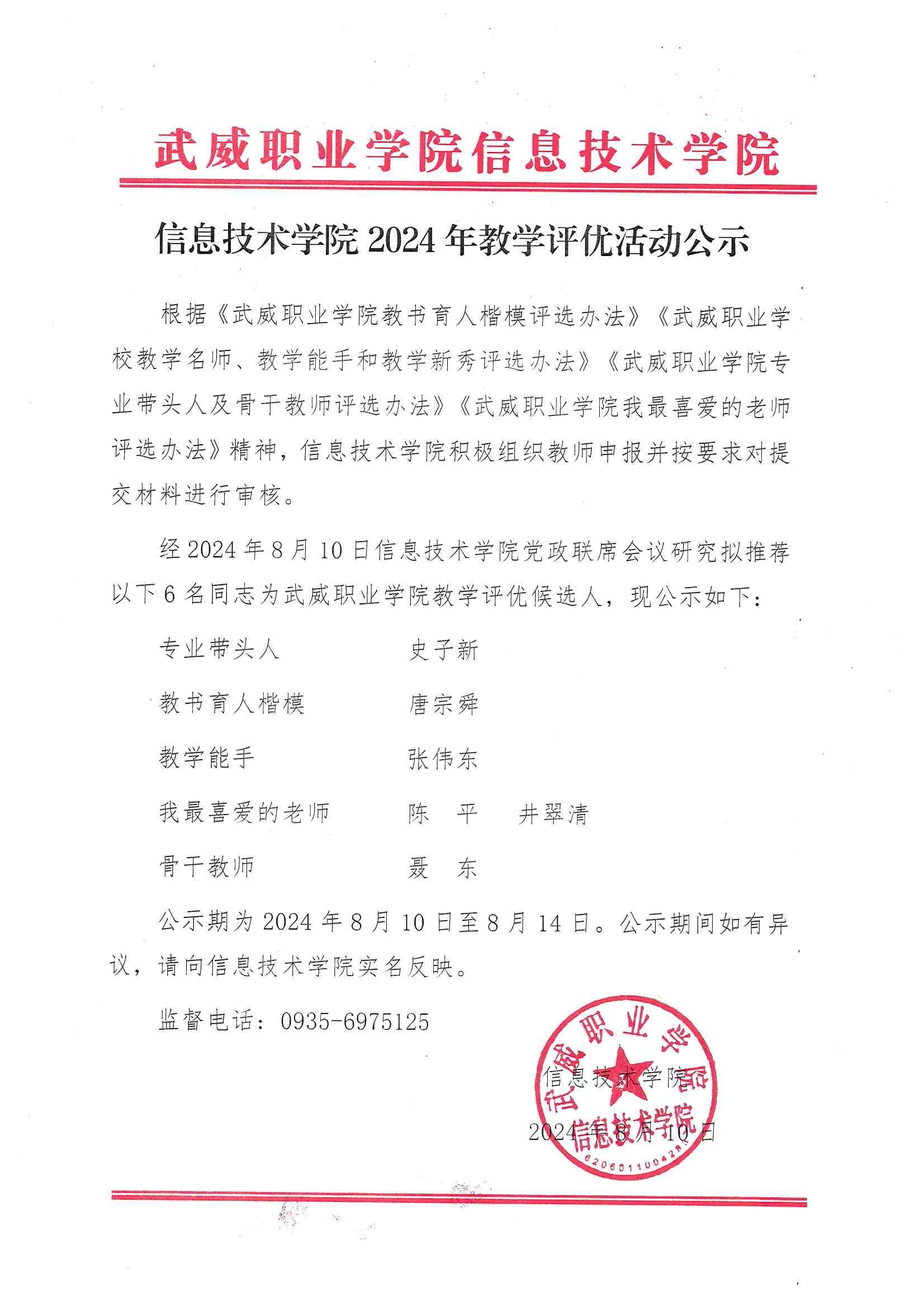信息技術(shù)學(xué)院關(guān)于2024年教學(xué)評優(yōu)活動(dòng)公示