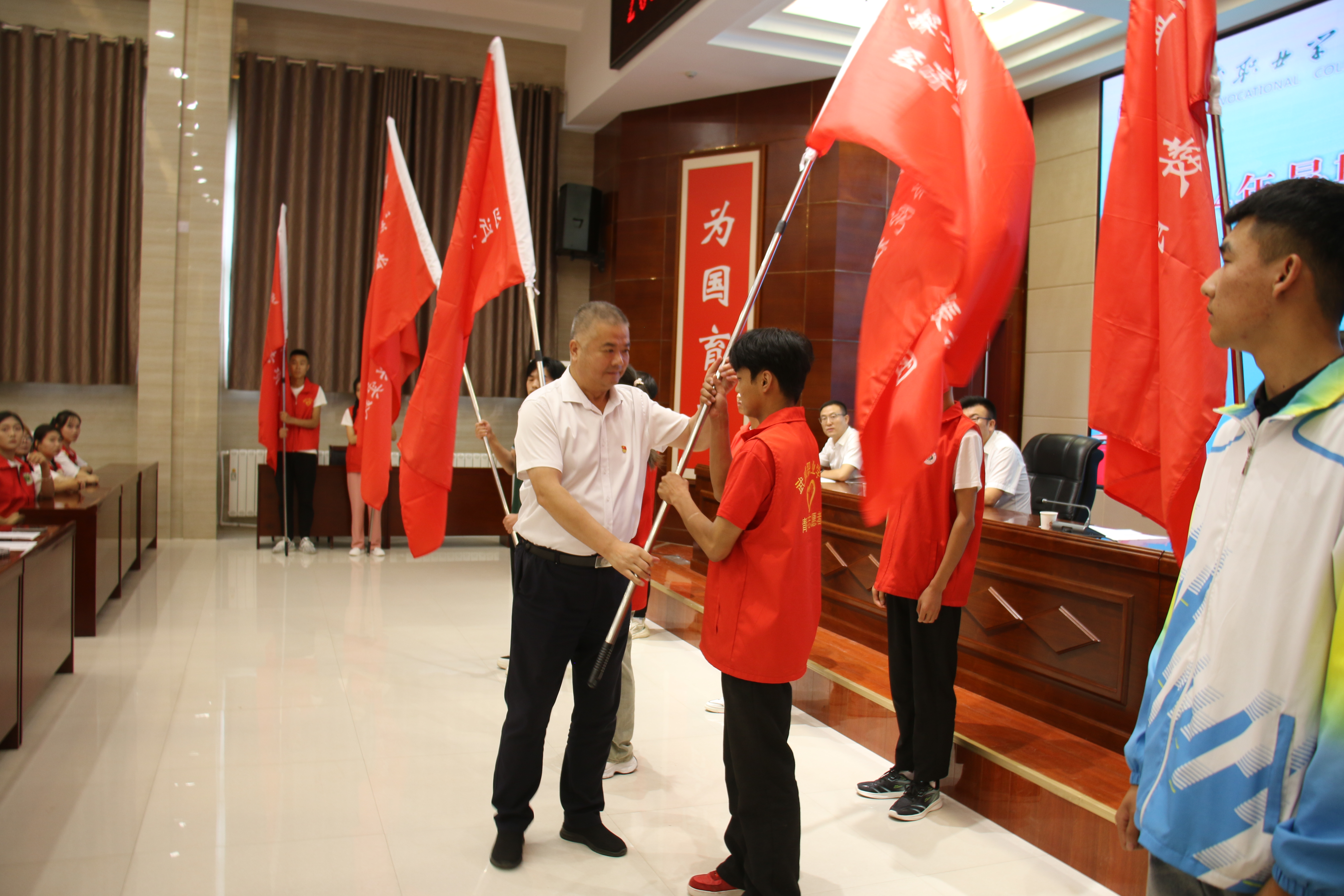 王守云為國家級和省級重點(diǎn)立項(xiàng)團(tuán)隊(duì)授旗,并對即將啟程的實(shí)踐團(tuán)隊(duì)提出三點(diǎn)希望和要求:一是要緊扣活動主題,在學(xué)思踐悟中筑牢信仰根基;二是積極探索實(shí)踐,在篤行實(shí)干中練就過硬本領(lǐng);三是主動擔(dān)當(dāng)作為,在踔厲奮發(fā)中展示武職風(fēng)采。希望同學(xué)們向下扎根、向上生長,鍛煉自我的同時(shí),筑牢“安全防線”,高質(zhì)量開展本次社會實(shí)踐活動,收獲成長與進(jìn)步,將“三下鄉(xiāng)”活動打造為我校形象展示的重要窗口和靚麗名片。