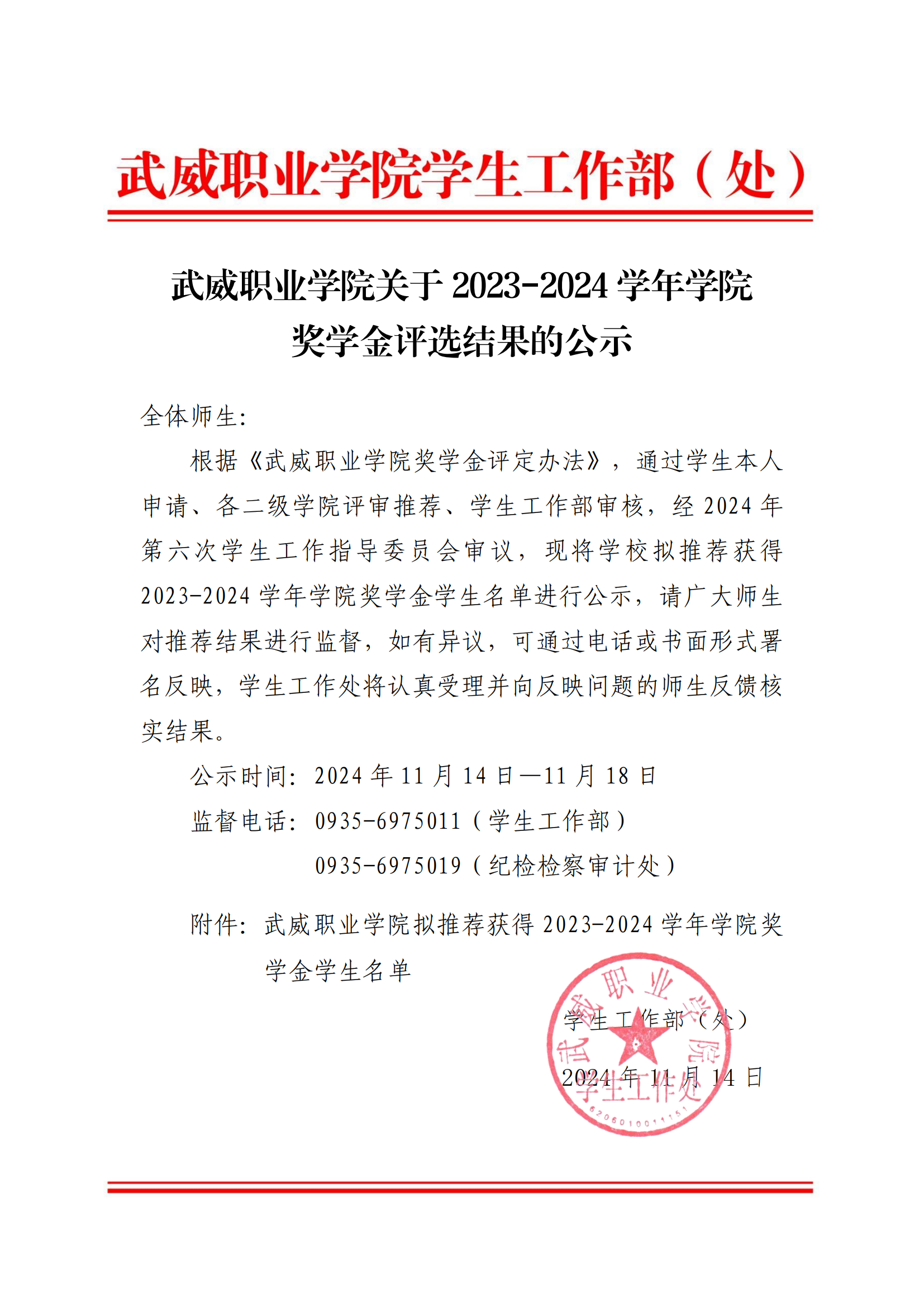 武威職業(yè)學(xué)院關(guān)于2023-2024學(xué)年學(xué)院獎(jiǎng)學(xué)金評(píng)選結(jié)果的公示