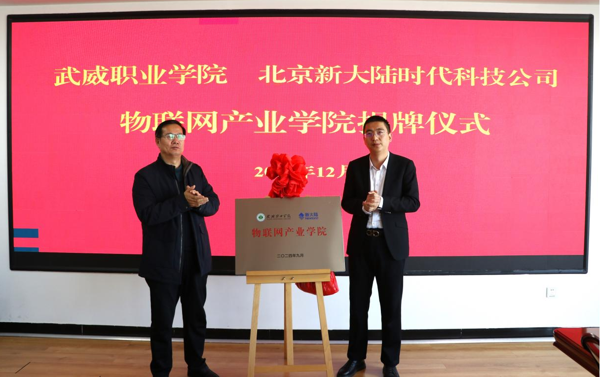 為全面深化產(chǎn)教融合,加強(qiáng)校企合作,進(jìn)一步提高我校人才培養(yǎng)質(zhì)量。12月3日,學(xué)校在能源科技樓811會(huì)議室舉行武威職業(yè)學(xué)院和北京新大陸時(shí)代科技公司物聯(lián)網(wǎng)產(chǎn)業(yè)學(xué)院簽約暨揭牌儀式。北京新大陸時(shí)代科技公司西北區(qū)總監(jiān)劉寧、技術(shù)總監(jiān)樊斌,相關(guān)業(yè)務(wù)部門負(fù)責(zé)人,學(xué)校校長(zhǎng)、黨委副書記張開禮、黨委副書記翟存祥、相關(guān)部門負(fù)責(zé)人及教師代表參加活動(dòng)。黨委委員、副校長(zhǎng)王永緒主持儀式。