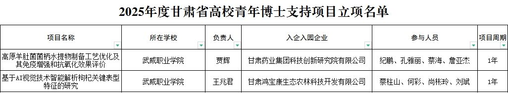 近日,甘肅省教育廳公布了2025年度甘肅省高校青年博士支持項(xiàng)目評審結(jié)果公示,我校賈輝博士主持的《高原羊肚菌菌柄水提物制備工藝優(yōu)化及其免疫增強(qiáng)和抗氧化效果評價》和王兆君博士主持的《基于AI視覺技術(shù)智能解析枸杞關(guān)鍵表型特征的研究》2個研究項(xiàng)目成功獲批。