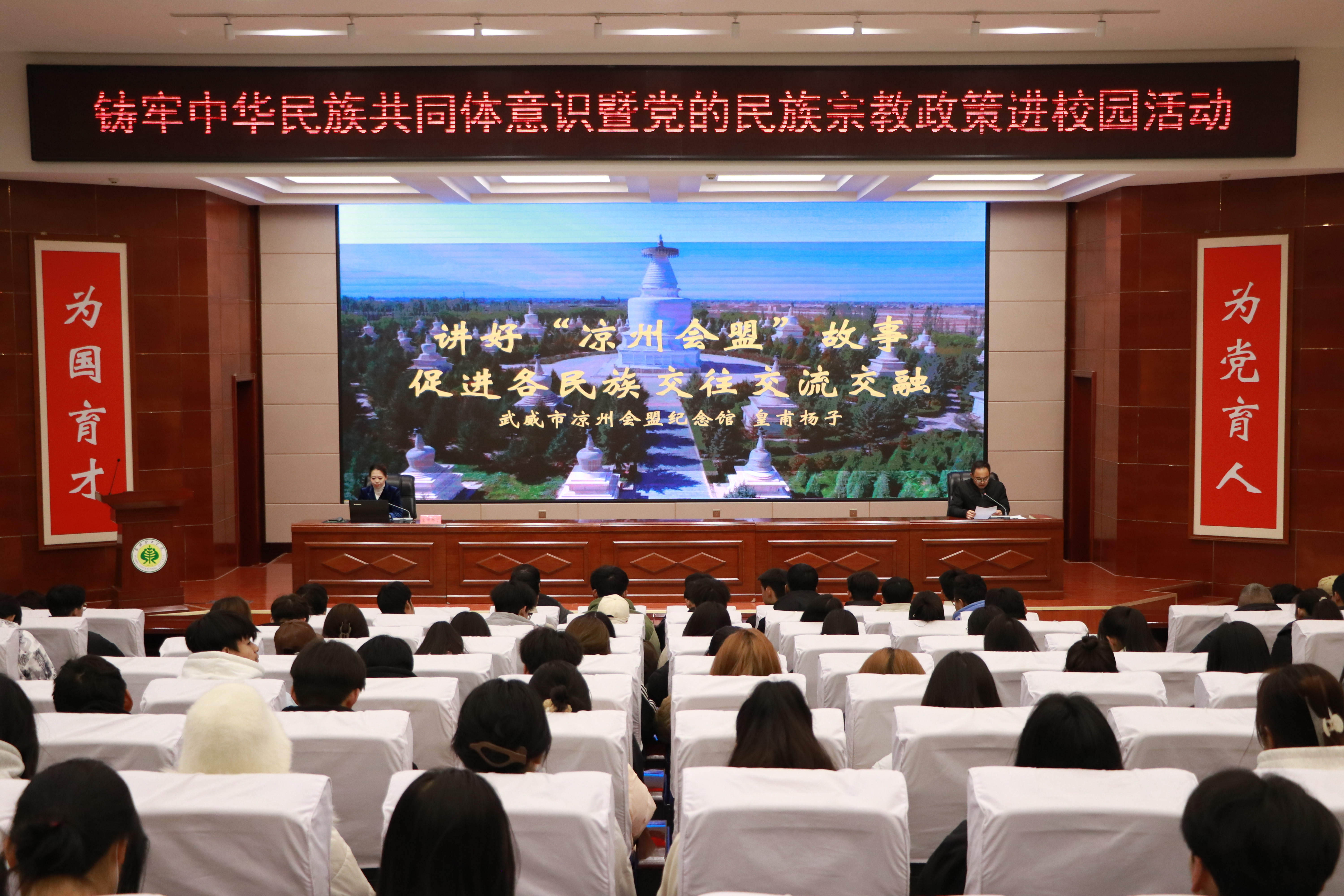 12月19日,學(xué)校聯(lián)合武威市涼州會盟紀(jì)念館,成功舉辦了鑄牢中華民族共同體意識暨民族宗教政策進校園系列活動?;顒庸参?00余名師生參觀聽講。