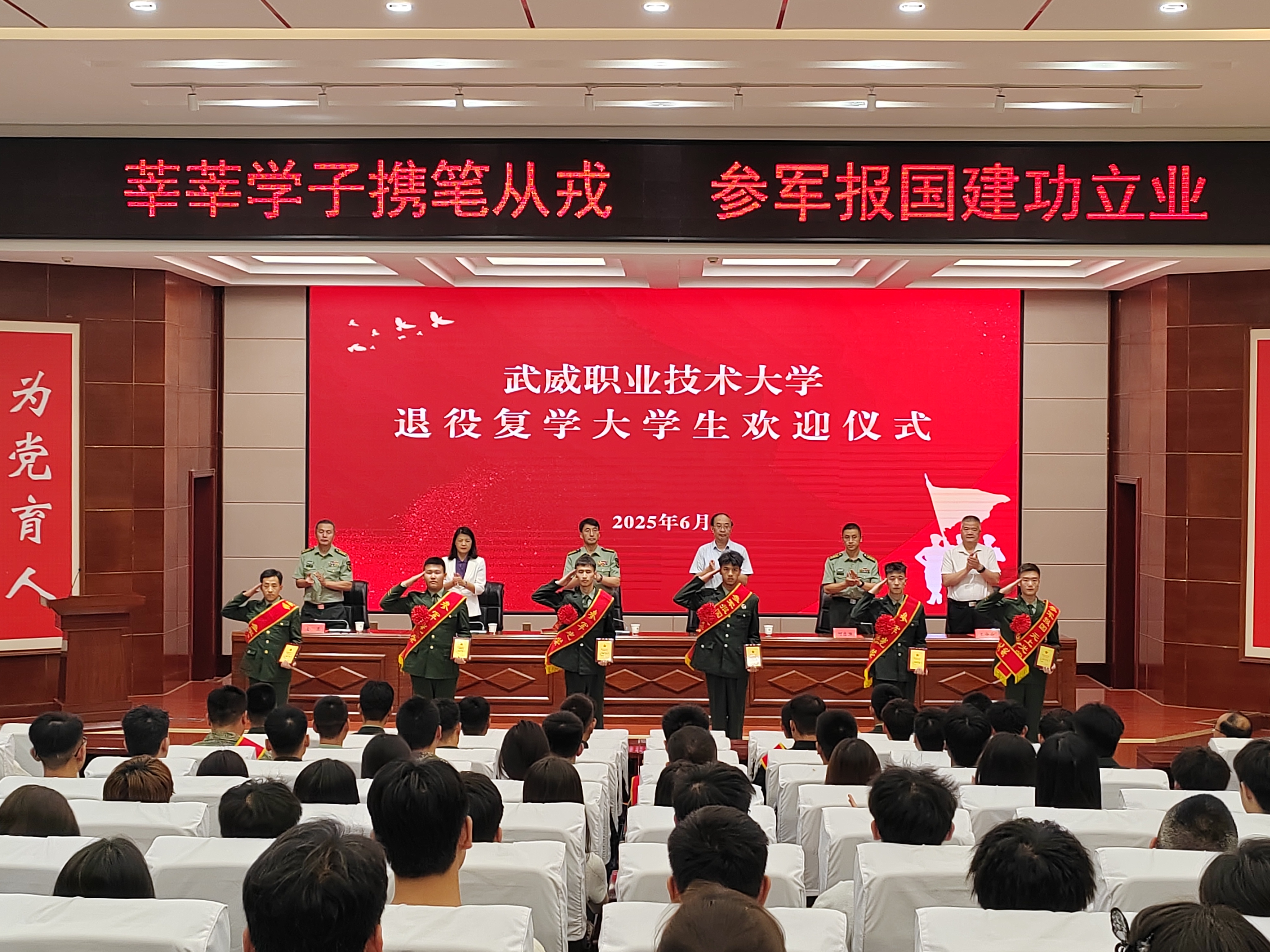 活動(dòng)現(xiàn)場(chǎng)為2024—2025學(xué)年退役復(fù)學(xué)大學(xué)生舉行了歡迎儀式,并為他們頒發(fā)“退役復(fù)學(xué)軍人榮譽(yù)證牌”。退役復(fù)學(xué)大學(xué)生代表、醫(yī)學(xué)技術(shù)學(xué)院2024級(jí)針灸推拿大專(zhuān)(2)班周榮臻同學(xué)講述了軍旅生涯的磨煉和成長(zhǎng)感悟,并號(hào)召青年大學(xué)生積極報(bào)名參軍;2025年應(yīng)征報(bào)名大學(xué)生代表、藥學(xué)院2024級(jí)藥學(xué)大專(zhuān)(1)班劉鑫同學(xué)宣讀了參軍入伍倡議書(shū);駐武部隊(duì)優(yōu)秀大學(xué)生軍官代表符東洋少校分享了自己在部隊(duì)的成長(zhǎng)經(jīng)歷。