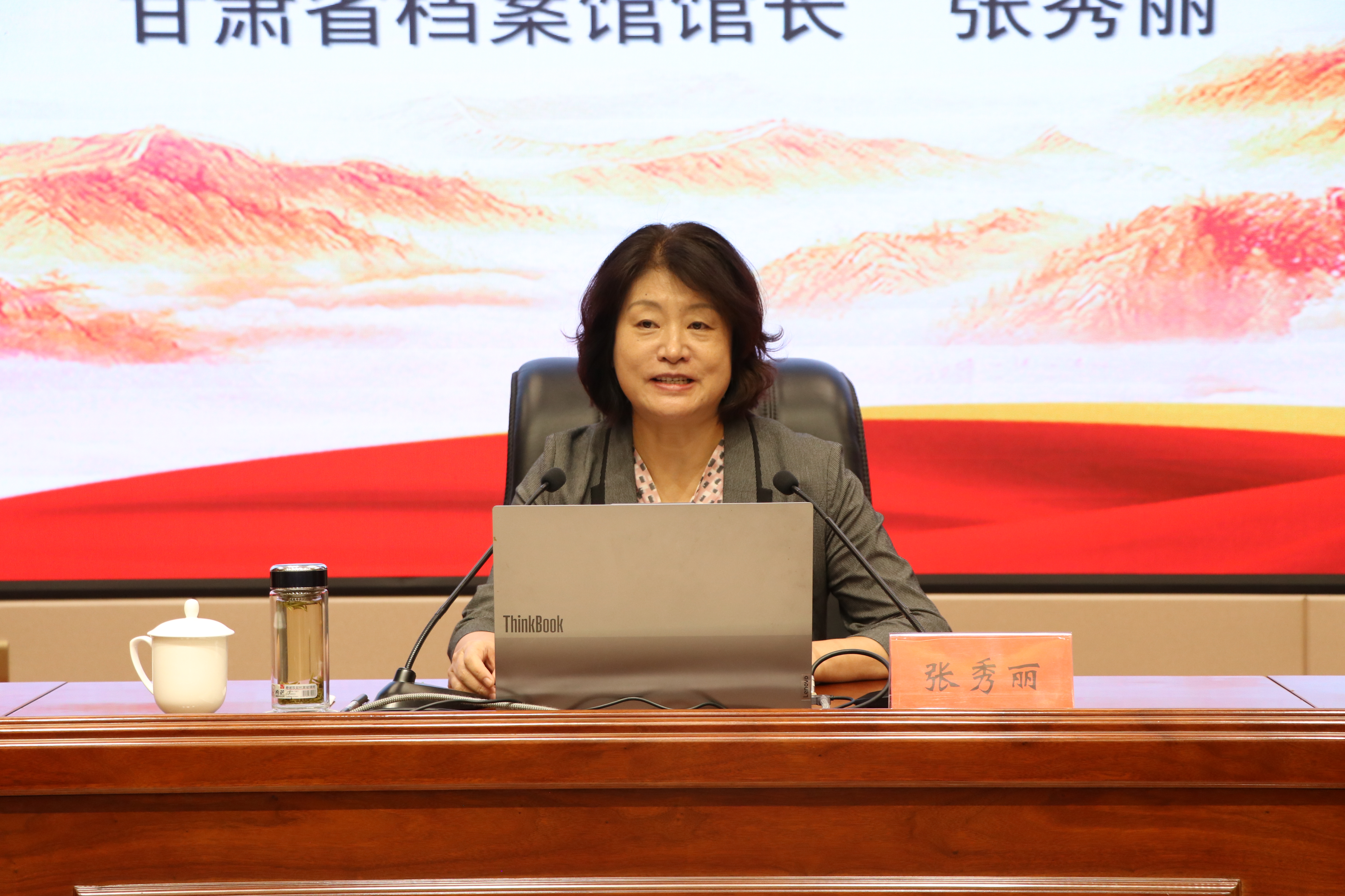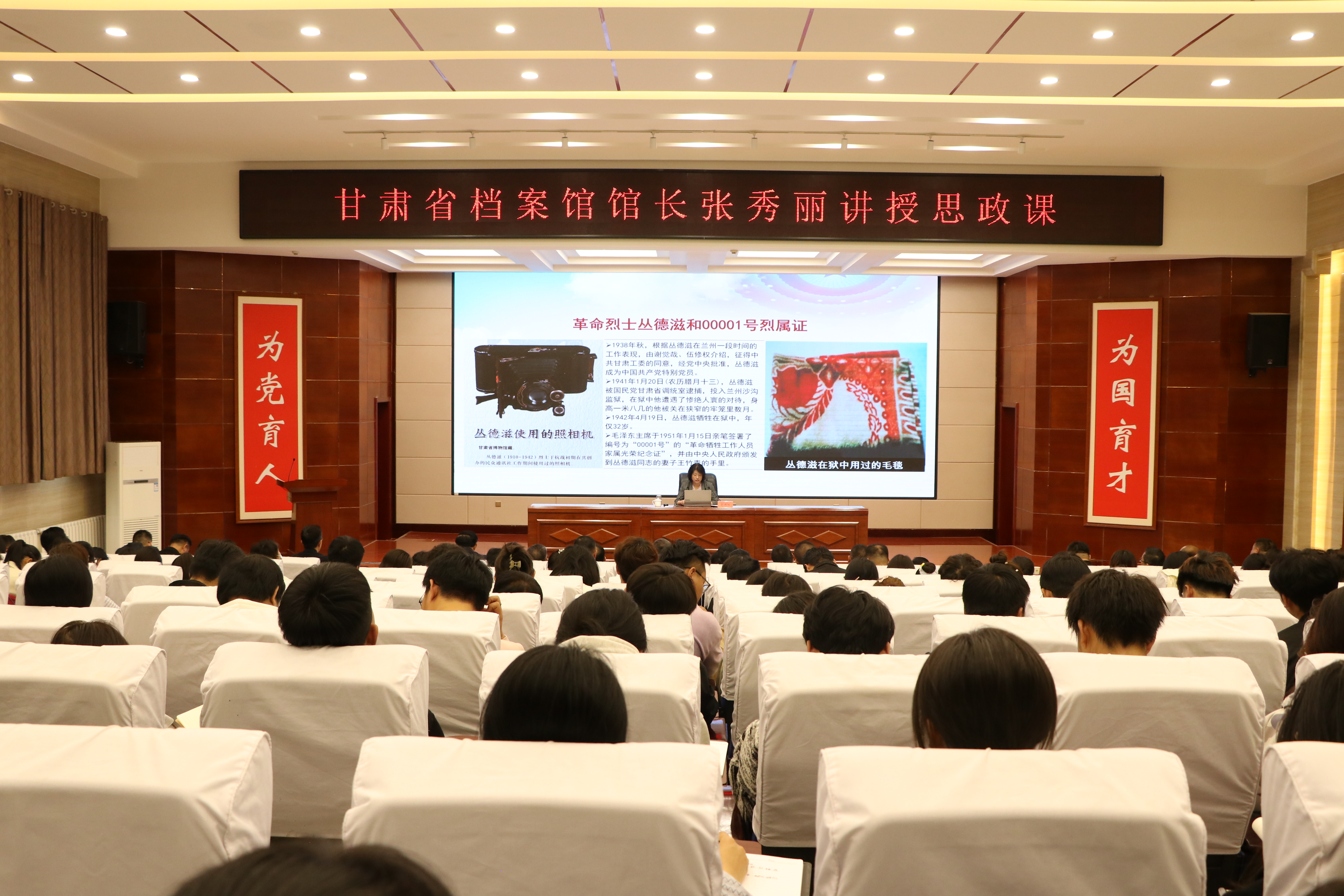 張秀麗結(jié)合自身從事檔案管理和文化研究的豐富經(jīng)驗,從檔案“存史、資政、育人”根本任務(wù)出發(fā),通過大量珍貴檔案文獻和歷史案例,系統(tǒng)闡述了檔案在記錄民族苦難輝煌、服務(wù)當代治國理政、培育時代新人中的重要作用。報告中,她以館藏漢代簡牘、革命烈士叢德滋00001號烈屬證、民勤治沙檔案、甘肅地震檔案等一批具有歷史代表性和地域特色的檔案為載體,帶領(lǐng)師生穿越時空,感受中華民族生生不息的精神力量,深刻解讀“勿忘昨天的苦難輝煌,無愧今天的使命擔當,不負明天的偉大夢想”的時代內(nèi)涵。