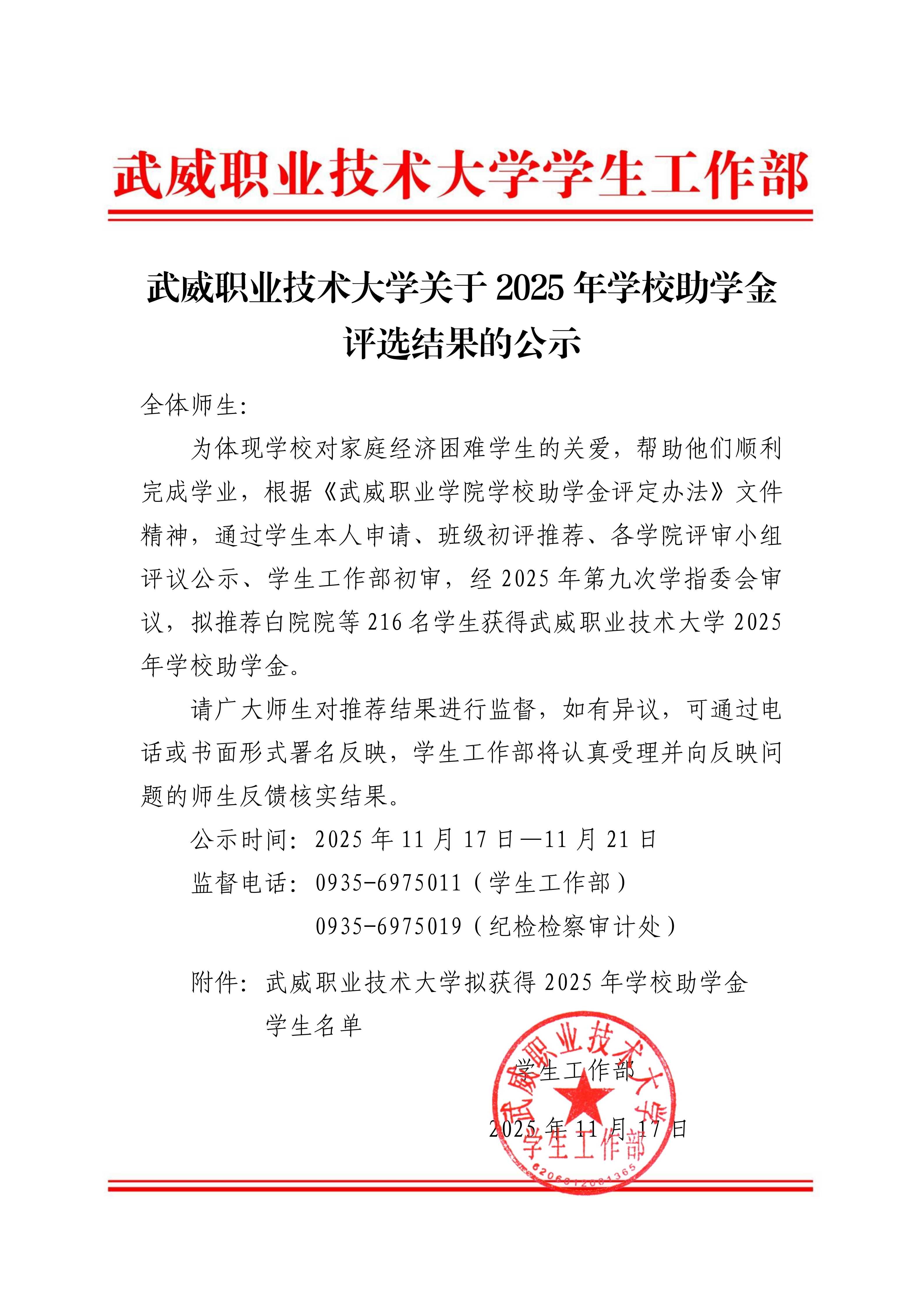 武威職業(yè)技術(shù)大學(xué)關(guān)于2025年學(xué)校助學(xué)金評選結(jié)果的公示