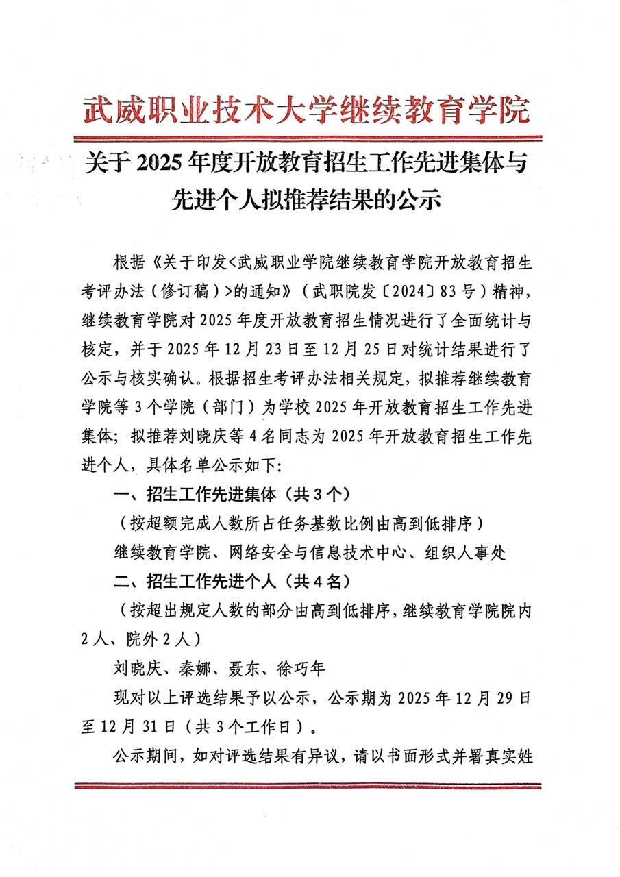 關(guān)于2025年度開放教育招生工作先進(jìn)集體與先進(jìn)個人擬推薦結(jié)果的公示