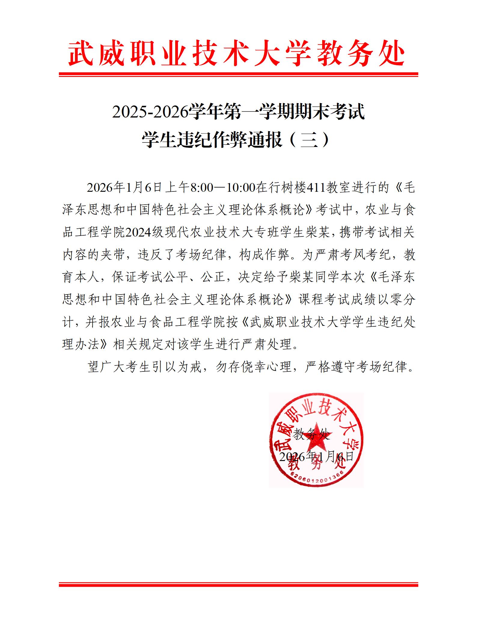 2025-2026學(xué)年第一學(xué)期期末考試學(xué)生違紀(jì)作弊通報(bào)(三)