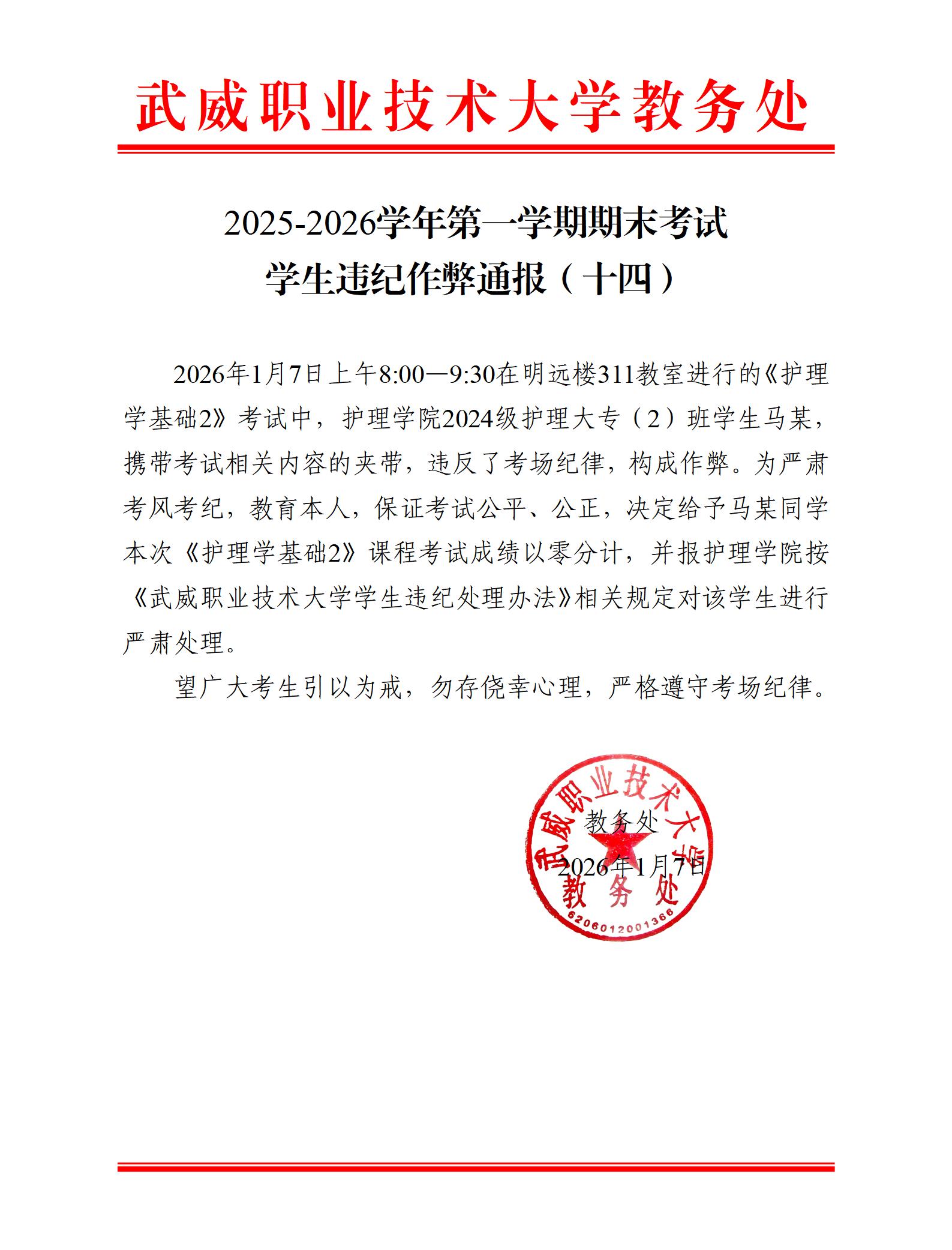 2025-2026學(xué)年第一學(xué)期期末考試學(xué)生違紀作弊通報(十四)