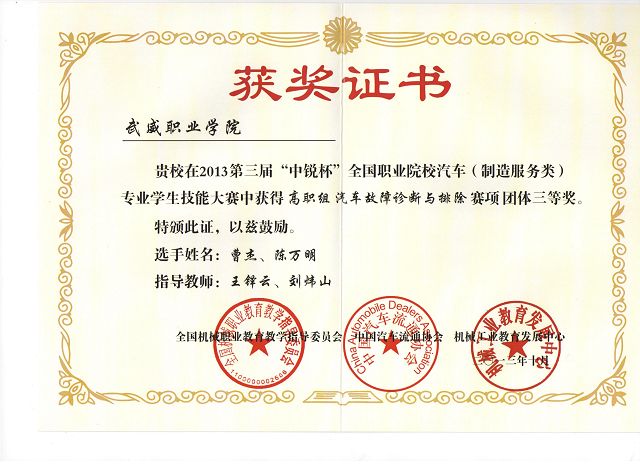 學(xué)院自接到《關(guān)于舉辦第三屆“中銳杯”全國職業(yè)院校汽車(制造服務(wù)類)專業(yè)學(xué)生技能大賽的通知》之后,學(xué)院領(lǐng)導(dǎo)對本次比賽高度重視,汽車工程系全體老師及學(xué)生對本次比賽更是充滿信心,汽車工程系專門召開了系部會議,組織討論了本次比賽的參賽方案,并確定了實訓(xùn)內(nèi)容、時間、地點和指導(dǎo)老師。經(jīng)過了各班推選、測試選拔、預(yù)賽、培訓(xùn)等環(huán)節(jié),最終決定由11級汽車檢測與維修中銳班陳萬明和曹杰兩位同學(xué)參加本次大賽。本次技能大賽分預(yù)選賽和決賽兩個賽程,預(yù)選賽采用遠程視頻預(yù)選,經(jīng)過遠程視頻預(yù)選賽的層層考核和選拔,我院參賽隊順利進入決賽名單。10月12日汽車工程系王鐸云和劉煒山兩位老師帶領(lǐng)參賽隊,赴江西南昌參加決賽。在決賽中,經(jīng)過激烈角逐,我院兩位參賽選手在全國36支高職組隊伍中脫穎而出,獲得了團體三等獎的優(yōu)異成績。