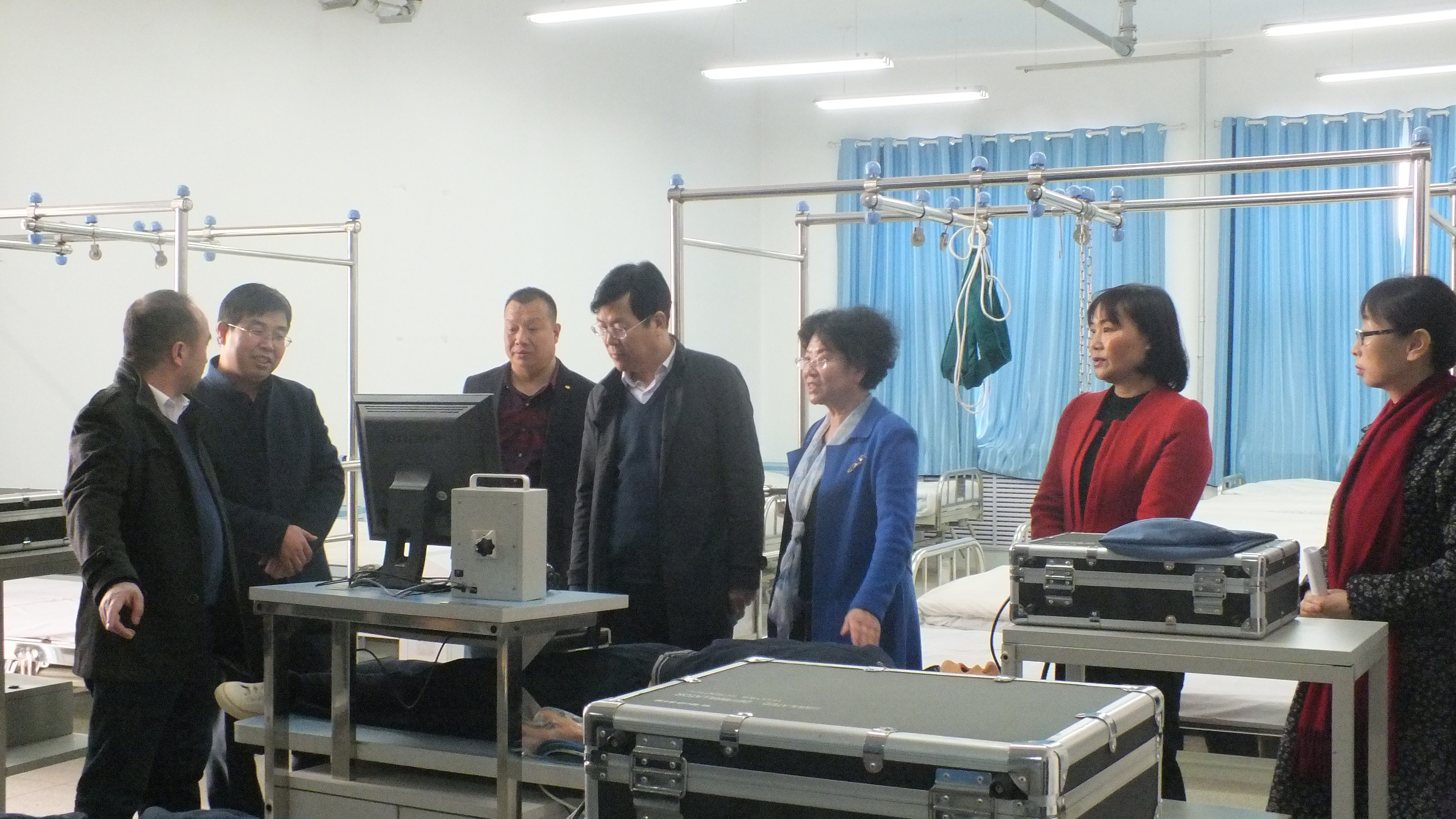 毛校長一行參觀了護理系的生命科技館、機能實訓(xùn)室、基護實訓(xùn)室、內(nèi)外科實訓(xùn)室等醫(yī)學(xué)類實訓(xùn)室,詳細了解了實驗設(shè)備的運行情況和實驗實訓(xùn)課程的教學(xué)管理模式。潘玉華向來賓們介紹了學(xué)院申辦臨床醫(yī)學(xué)專業(yè)的進展,以及我院實訓(xùn)課程建設(shè)和籌建實驗實訓(xùn)室取得的成果。