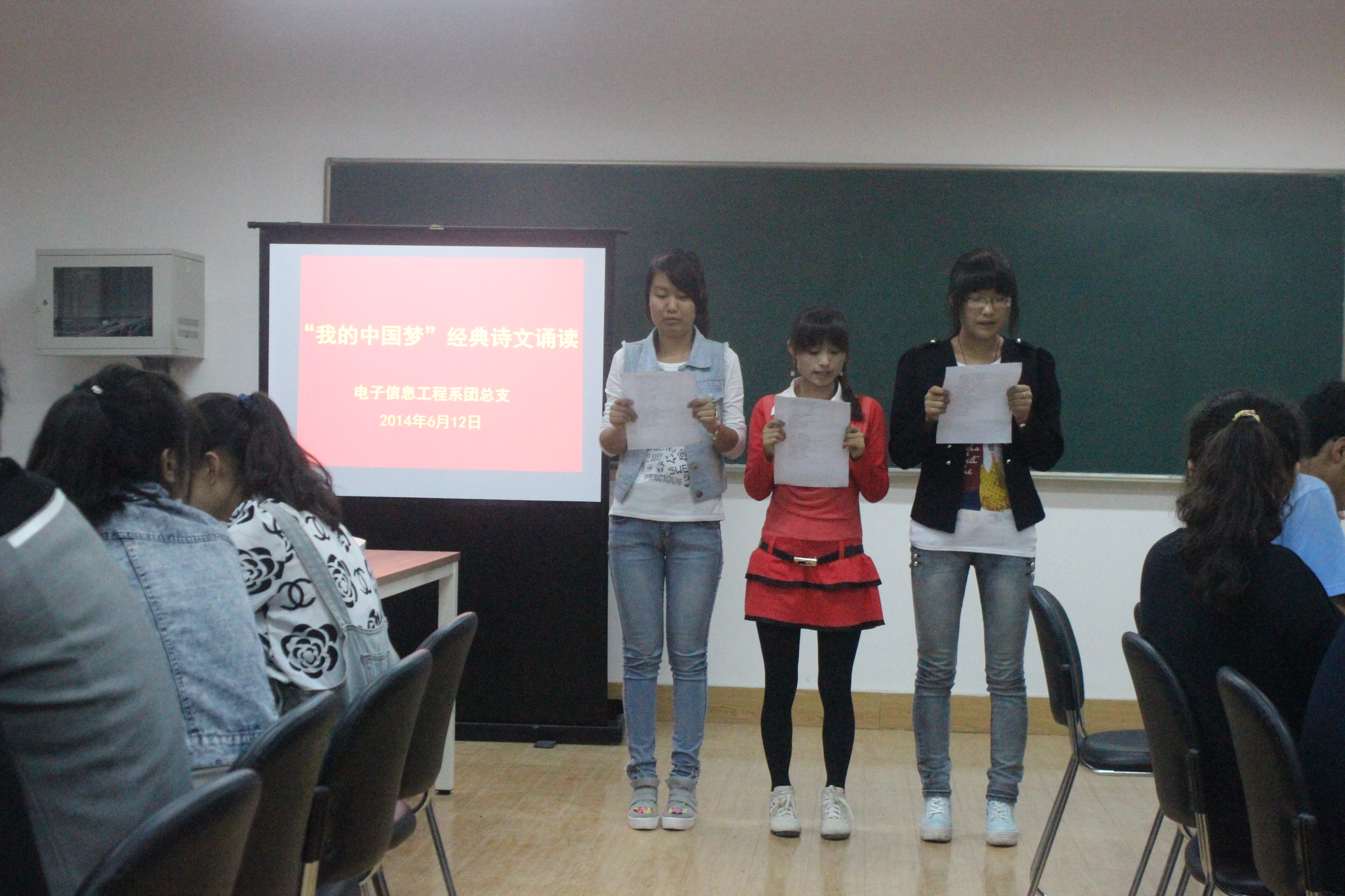 為進一步培育和弘揚社會主義核心價值觀,讓學(xué)生在經(jīng)典誦讀中觸摸中國傳統(tǒng)文化,增強愛國主義情懷,提升學(xué)生的文化底蘊和人文素養(yǎng),深入開展中國特色社會主義宣傳教育,教育和引導(dǎo)大學(xué)生樹立正確的理想信念,努力為實現(xiàn)國家富強、民族復(fù)興、人民幸福的偉大“中國夢”而努力。電子信息工程系團總支于6月12日晚在MIDP移動互聯(lián)網(wǎng)學(xué)院教研室舉辦“我的中國夢”經(jīng)典愛國詩文誦讀活動。