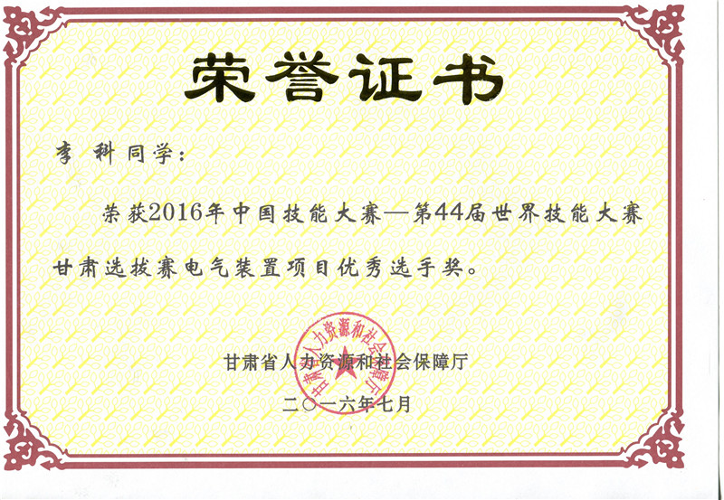 2016年中國技能大賽甘肅選拔賽電氣裝置項(xiàng)目優(yōu)秀獎