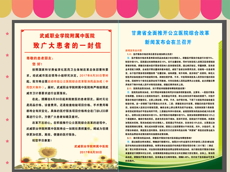 為了搞好公立醫(yī)院綜合改革,醫(yī)院加大對(duì)啟動(dòng)公立醫(yī)院綜合改革工作的宣傳力度,通過(guò)醫(yī)院門(mén)診大廳LED屏幕、電子顯示屏、宣傳展架、宣傳彩頁(yè)及微信公眾號(hào)推送等多種方式擴(kuò)大醫(yī)院綜合改革宣傳,對(duì)患者及家屬做好正面引導(dǎo)工作,為醫(yī)院綜合改革任務(wù)的落實(shí)營(yíng)造良好的氛圍。
